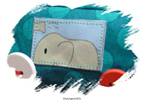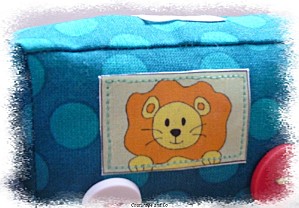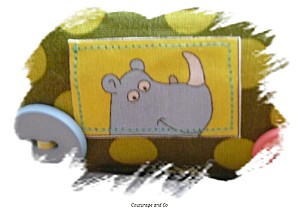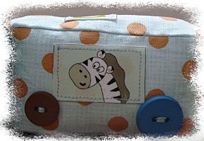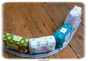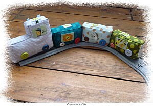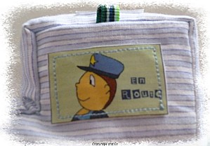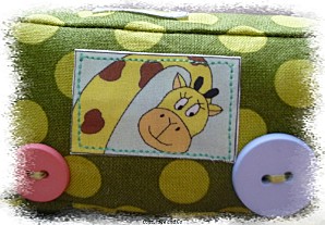 Toutes les vignettes ont été déssinées par mes soins, retranscrites sur mon ordi, et imprimées sur du papier transfert. Ce petit train a été un travail de véritable petite fourmi ! Chacune des coutures que vous pouvez voir ont été faites individuellement, car les pièces de tissus sont petites et il fallait conserver la forme rectangle, et puis par rapport au modèle original je me suis