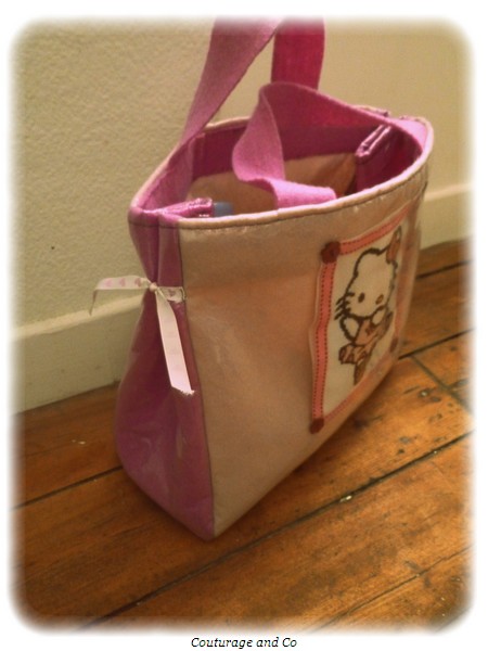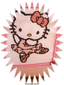 Pour customiser le sac la chipie avait choisi cette grille de broderie Hello Kitty (trouvée je ne sais ou sur la toile, mais que je doit encore avoir dans mon fichier), j’ai fixé le tout avec des rubans et des boutons de nacre.