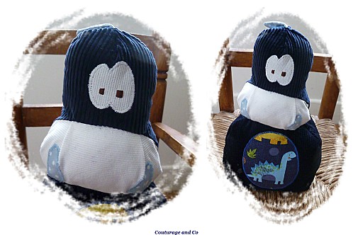 Aucune difficulté à le faire (Bouhh … comme c’est le deuxième … ca va plus vite !), je ne me suis toujours pas attaquée aux pieds, et par contre j’ai suivi le conseil précieux et judicieux de Nath’, qui a préconisé une couture machine a la tête et une ouverture pour rembourrage aux fesses ! Et franchement, et bien
