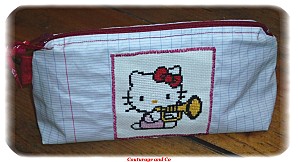 Tissus enduit « page de cahier » chez motif personnel, doublure coton rouge de mon stock perso, broderie HK faite par mes soins d’après le livre « Hello Kitty au point de croix » !!!!