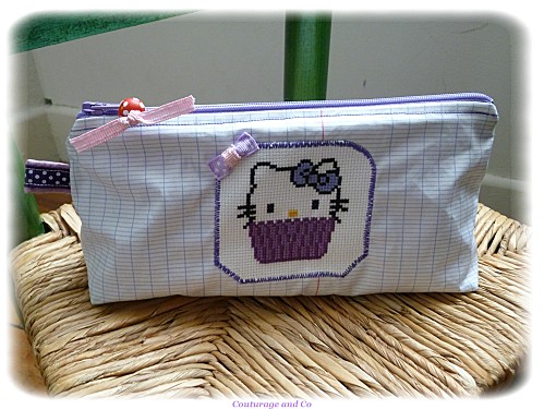 Une Grille Hello Kitty Cupcake crée et brodée par mes soins, tissus « Lignes de Cahier » enduit Motif Personnel et violet de mon stock perso.