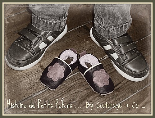 Les photos ne rendent pas trop hommage aux couleurs, ils sont aubergine, la fleur est rose foncée, le passepoil jaune et la semelle marron, doublure Première Etoile Guimauve de chez Motif Personnel.