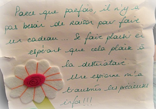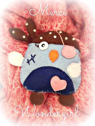 pour cette jolie broche en feutrine, qui trouvera sa place sur le dernier gilet que j’ai acheté, il est croisé et il me manquait justement ce genre de chose pour le fixer … un petit travail magnifique, rempli de minutie, ca ne peut que être fait avec amour, dans mes couleurs préférées, cachotière … et merci également a l’autre cachotière, ta saoeurette … mon amie …