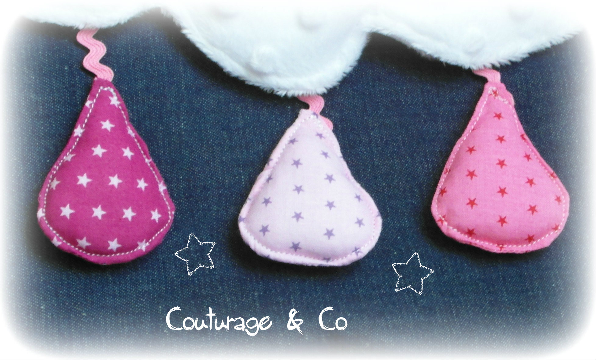 Jean et Rubans en provenance de mon stock personnel (ça commence a s’épuiser snif snif snif), popeline étoilée Frou Frou pour les gouttes en provenance de Ma Petite Mercerie, Minky Blanc a Pois en provenance de la Farandole des Tissus, et pour les bretelles Coton Première Etoile Guimauve de chez Motif personnel.