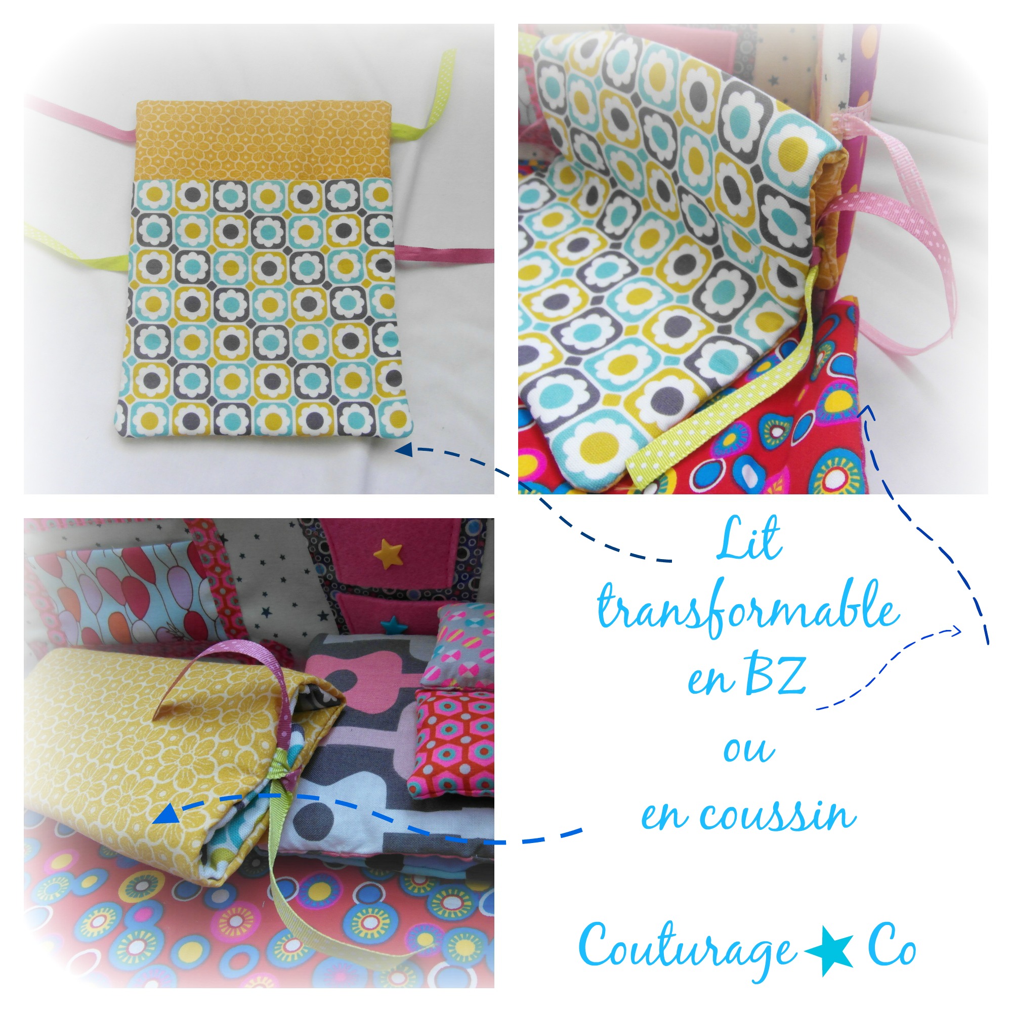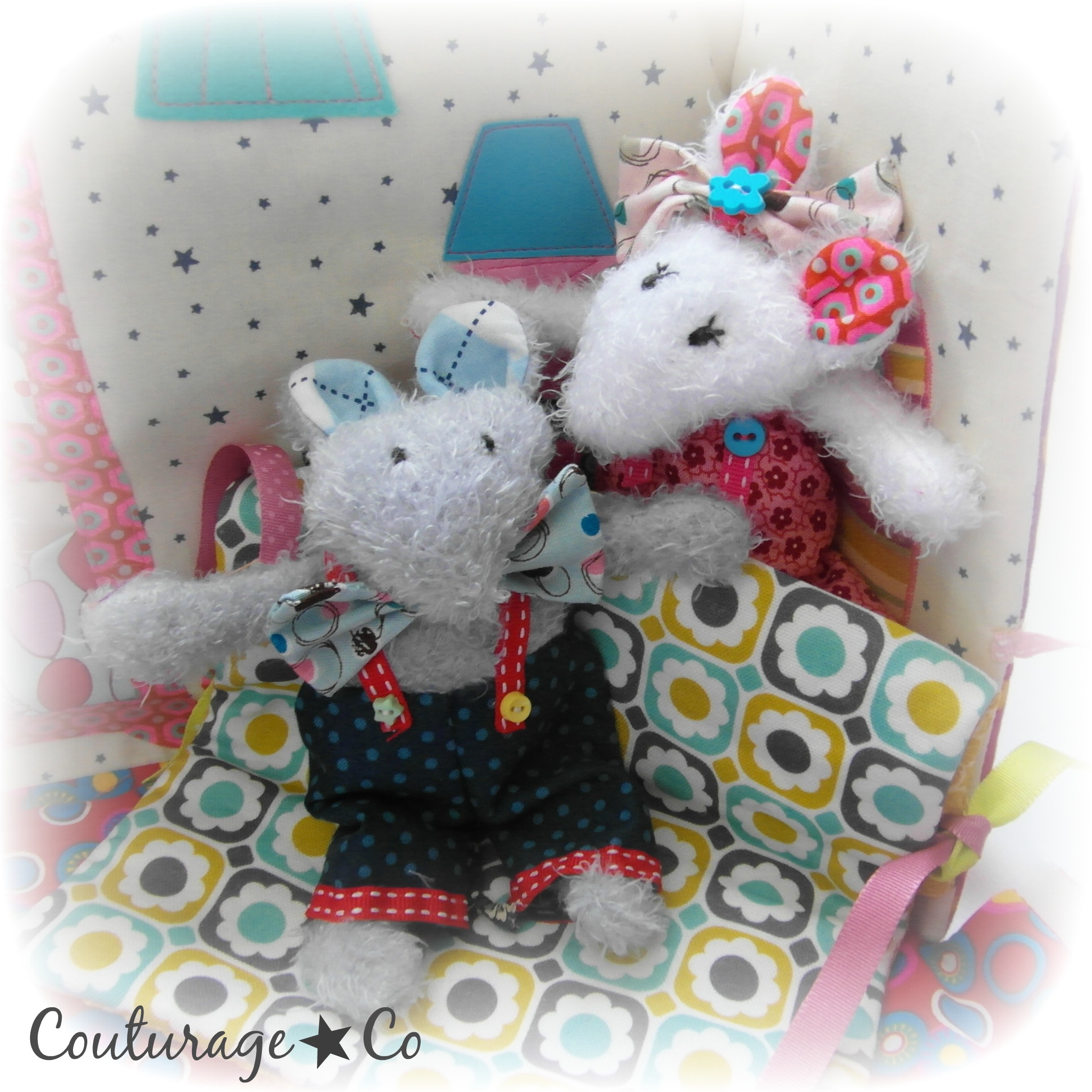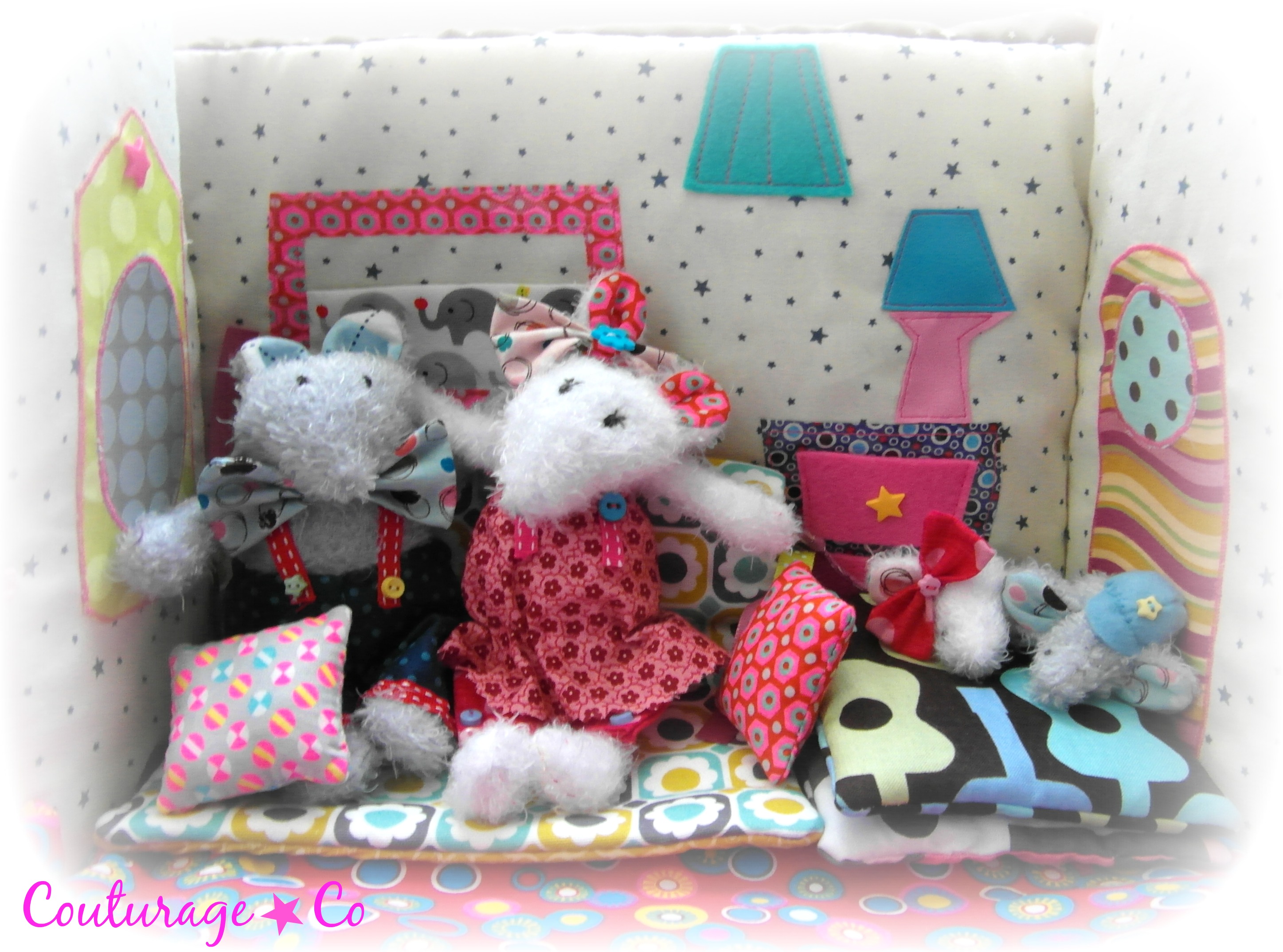J’ai juste bidouillé un peu le lit des parents pour donner plus de possibilités de jeux, et je me suis permise un habillage perso des bébés souris qui n’est pas dans le livre 😉