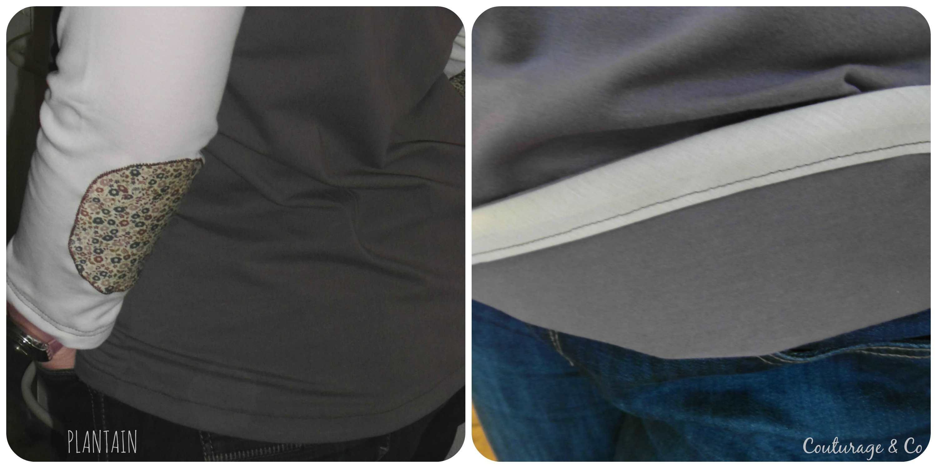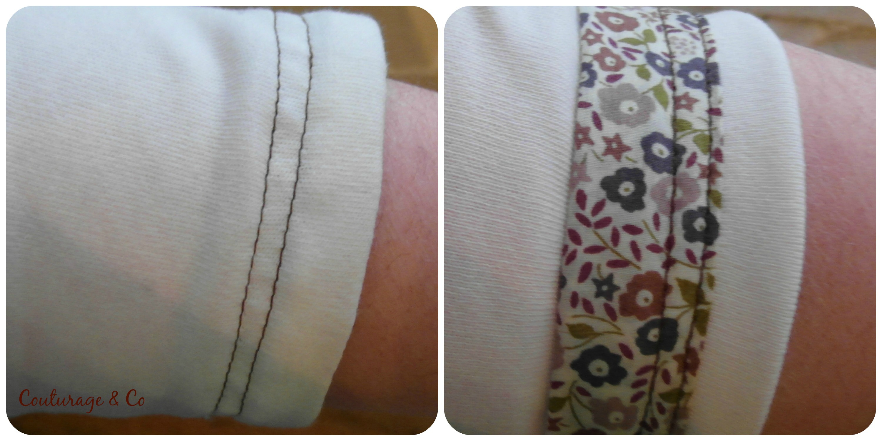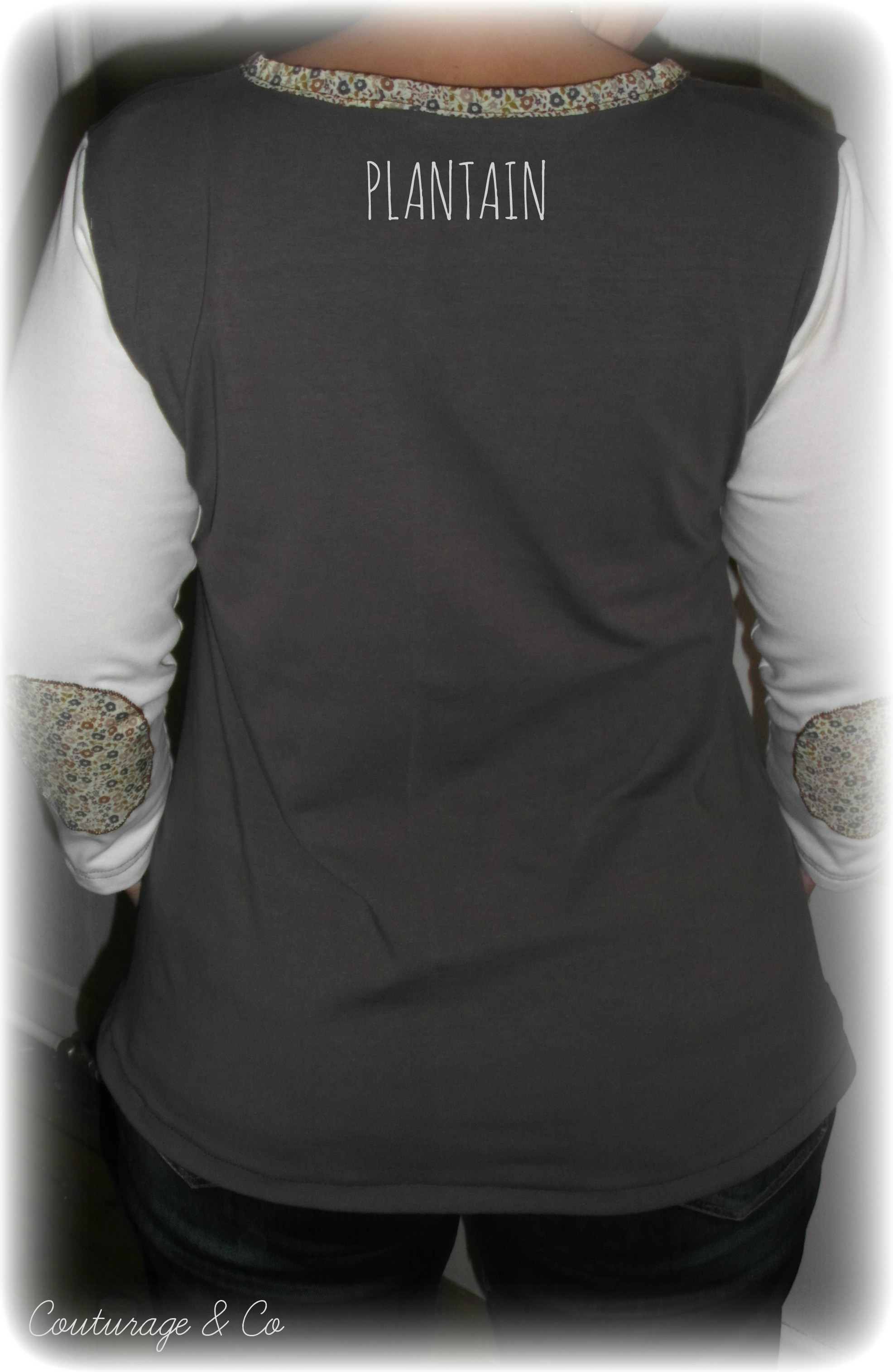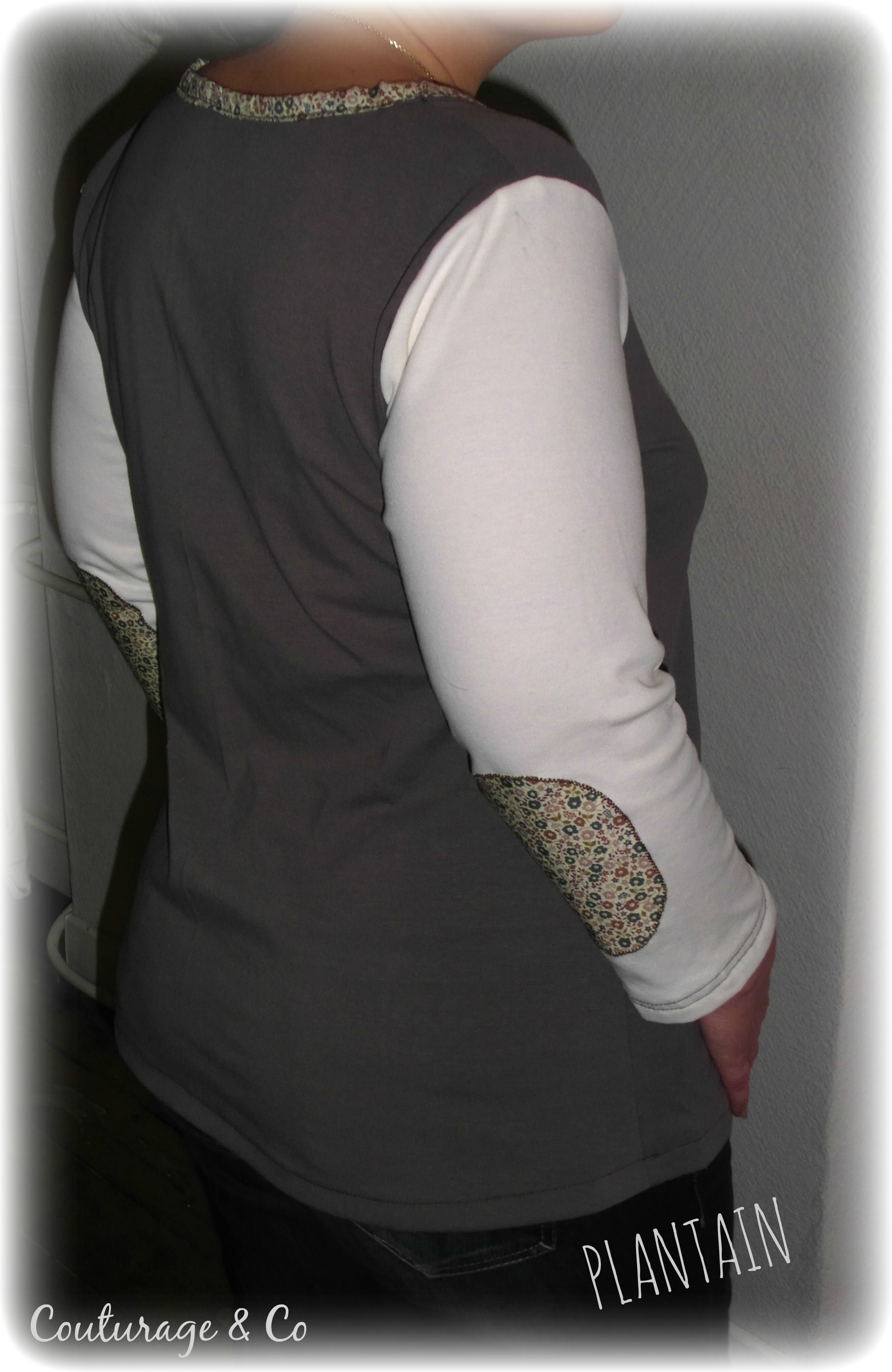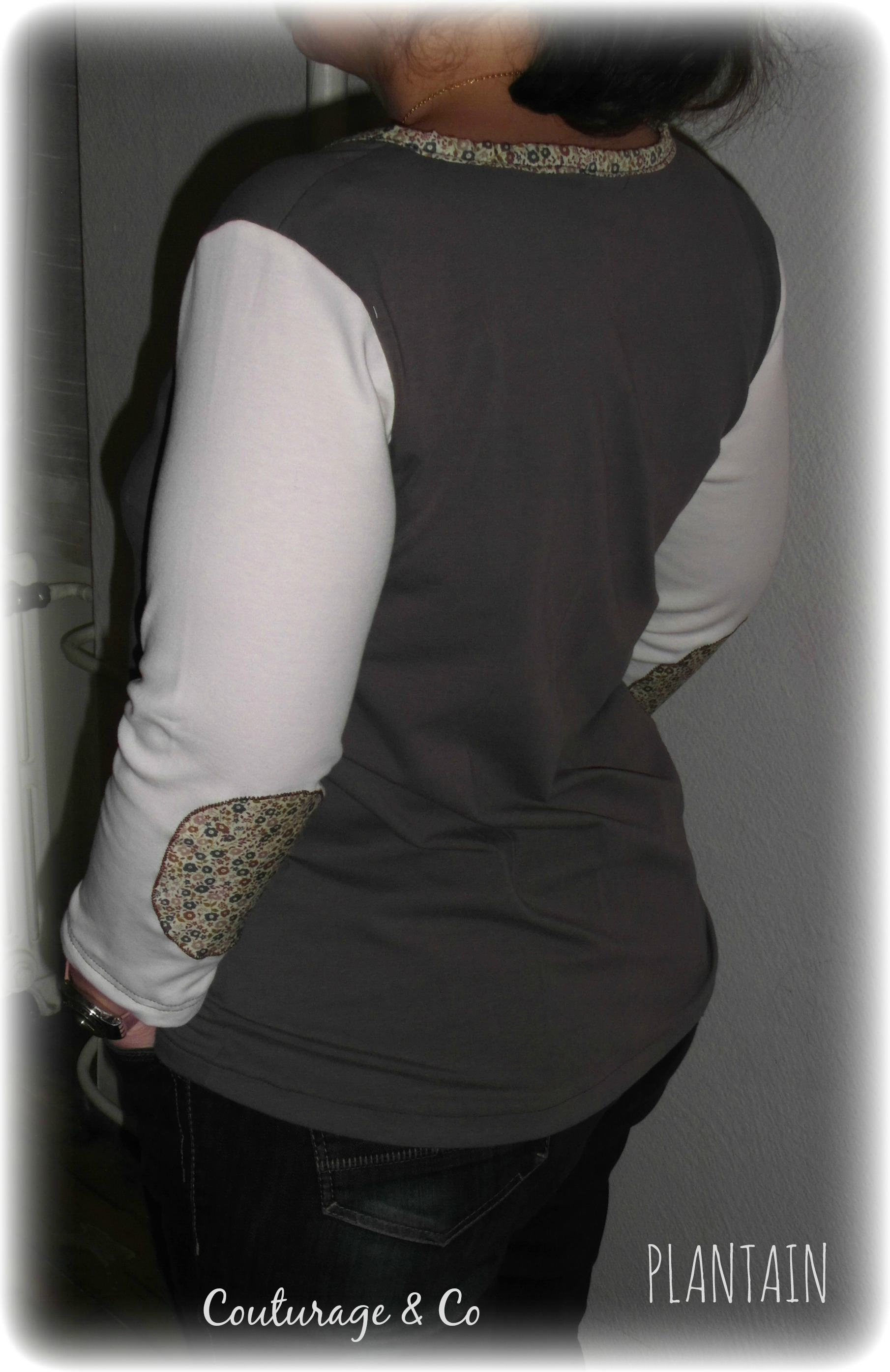 Jersey Blanc Cassé et Chocolat rapporté de mes vacances en Provence l’été dernier (Destinés normalement a des Today …. euh j’ai du retard ??? meuh non !!!! ), biais Maison Liberty de la Farandole des Tissus acheté il y a un moment déjà, même Liberty pour les coudières et le biais rapporté aux bas des manches, Biais Beige rapporté également en bas.