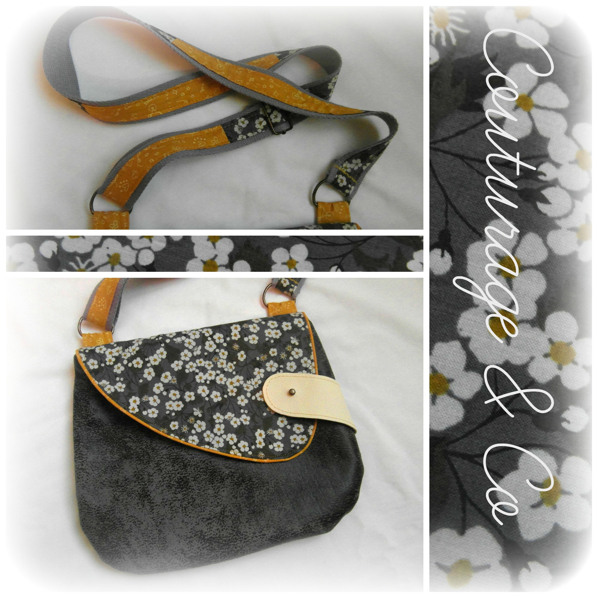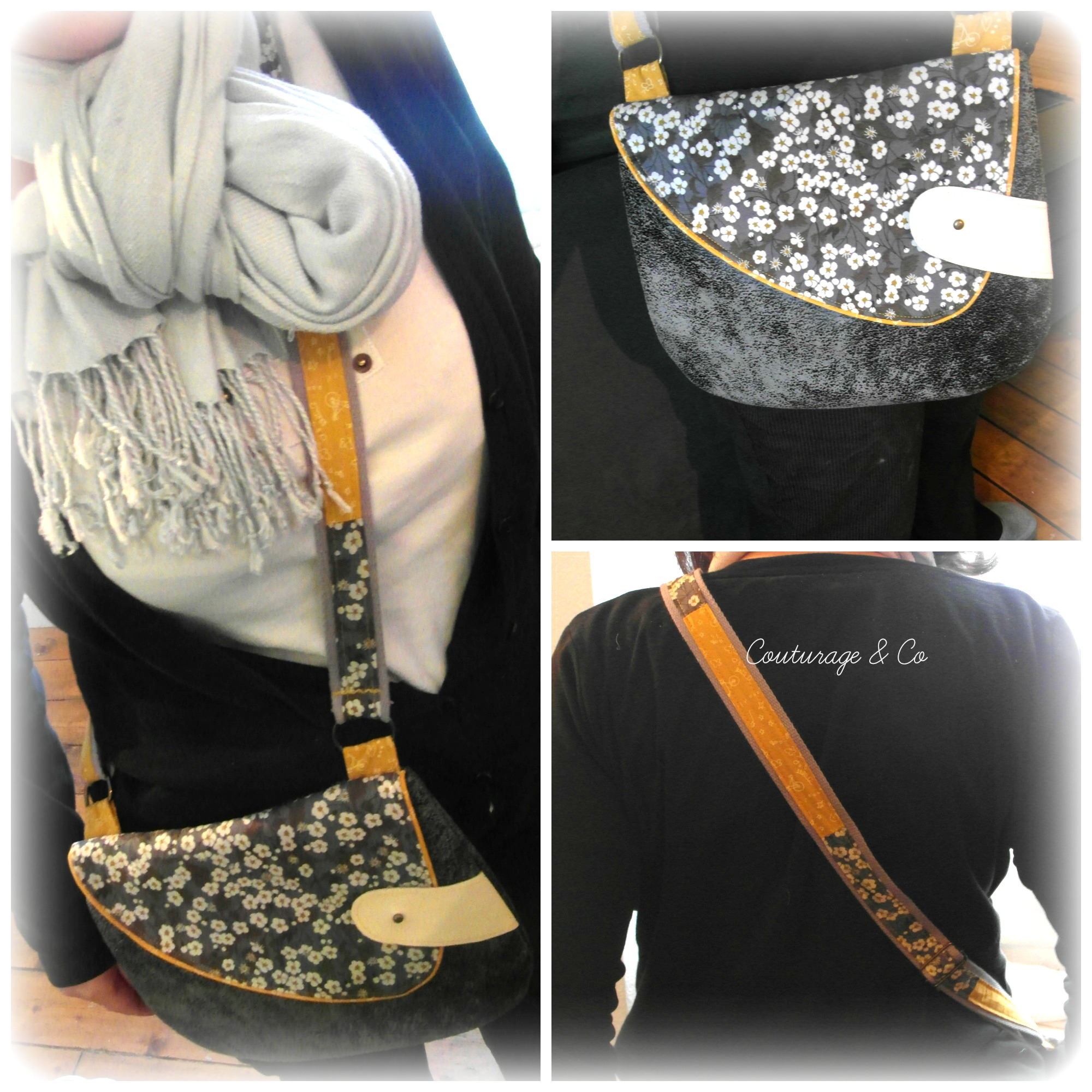 J’ai ajouté un biais au rabat, et j’ai custmiser une sangle coton avec une bande de tissus effet patch 😉