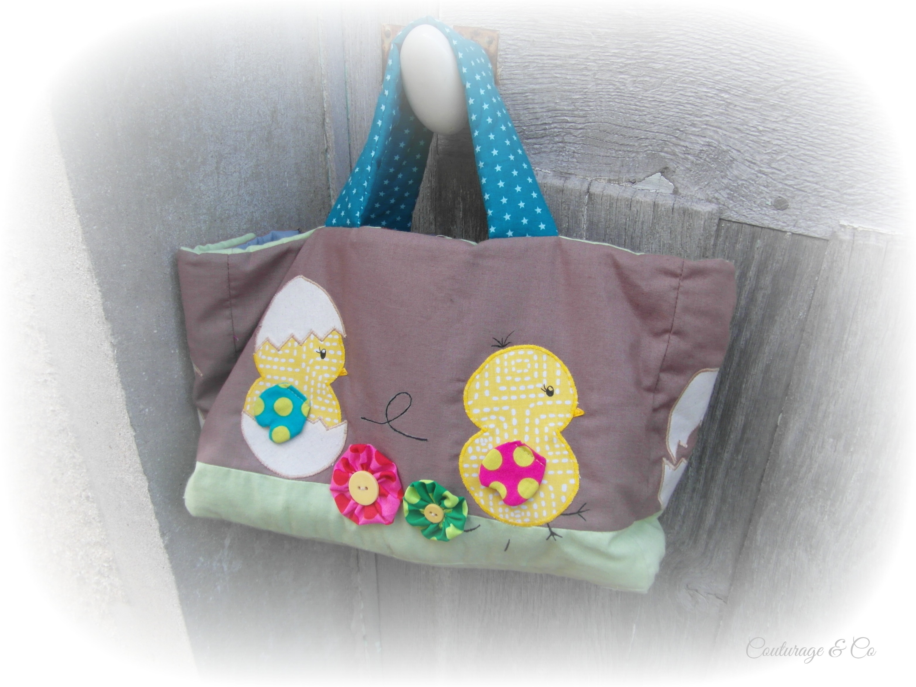 Ce qui, à première vue, ressemble à un simple cabas, adapté à la taille d’un enfant et décoré de petits dessins rigolos sur le thème Pascal, se transforme en un clin d’œil en un magnifique tapis de jeu !