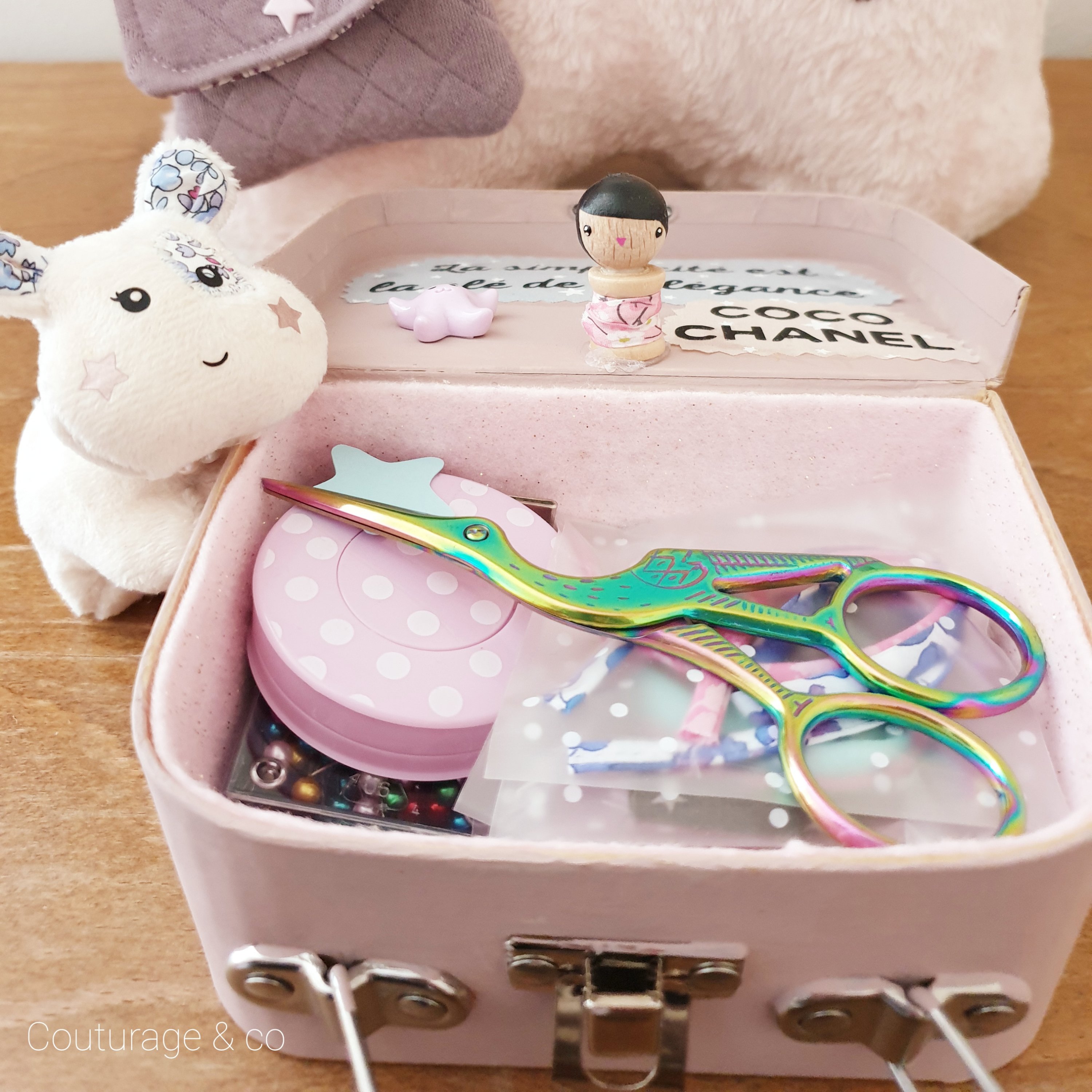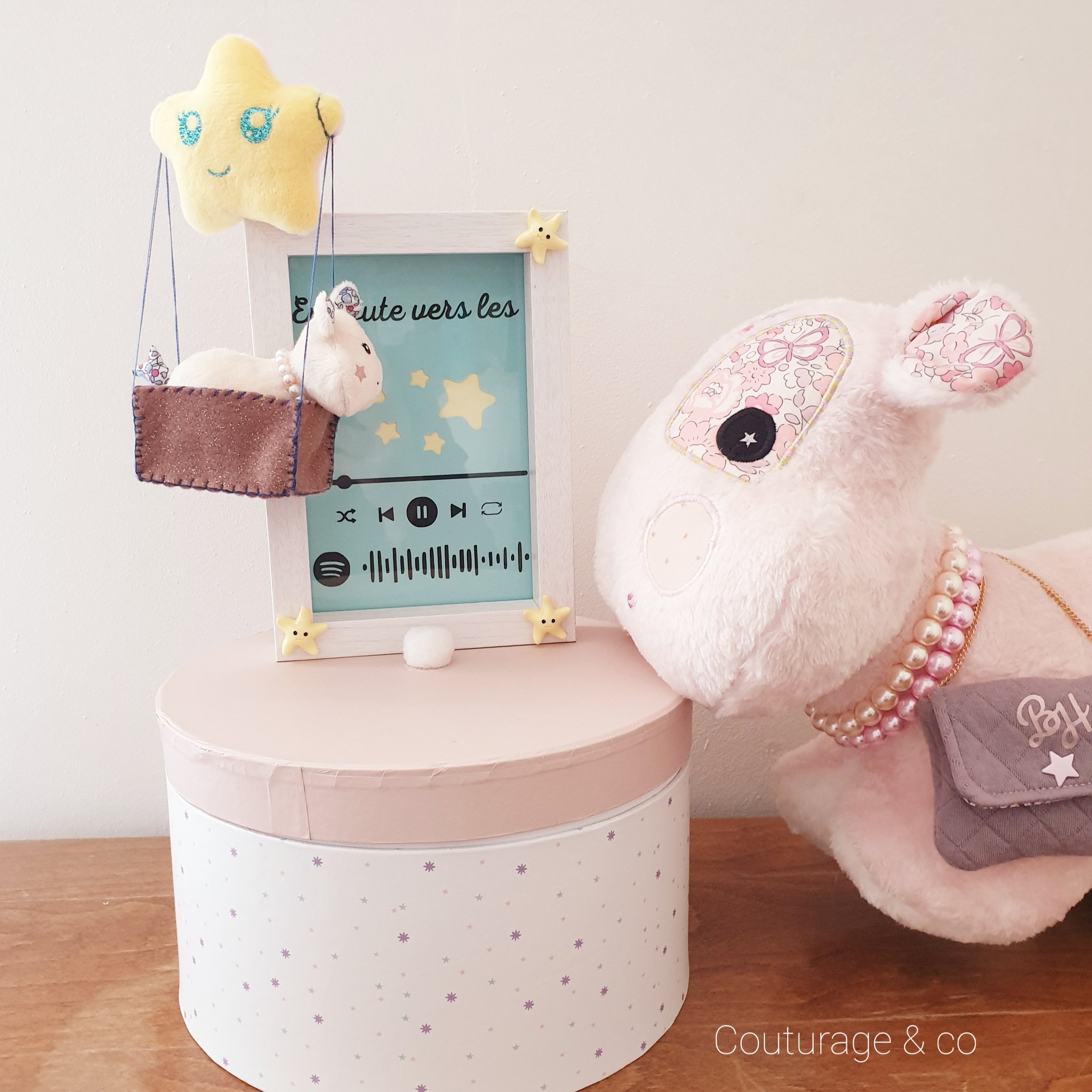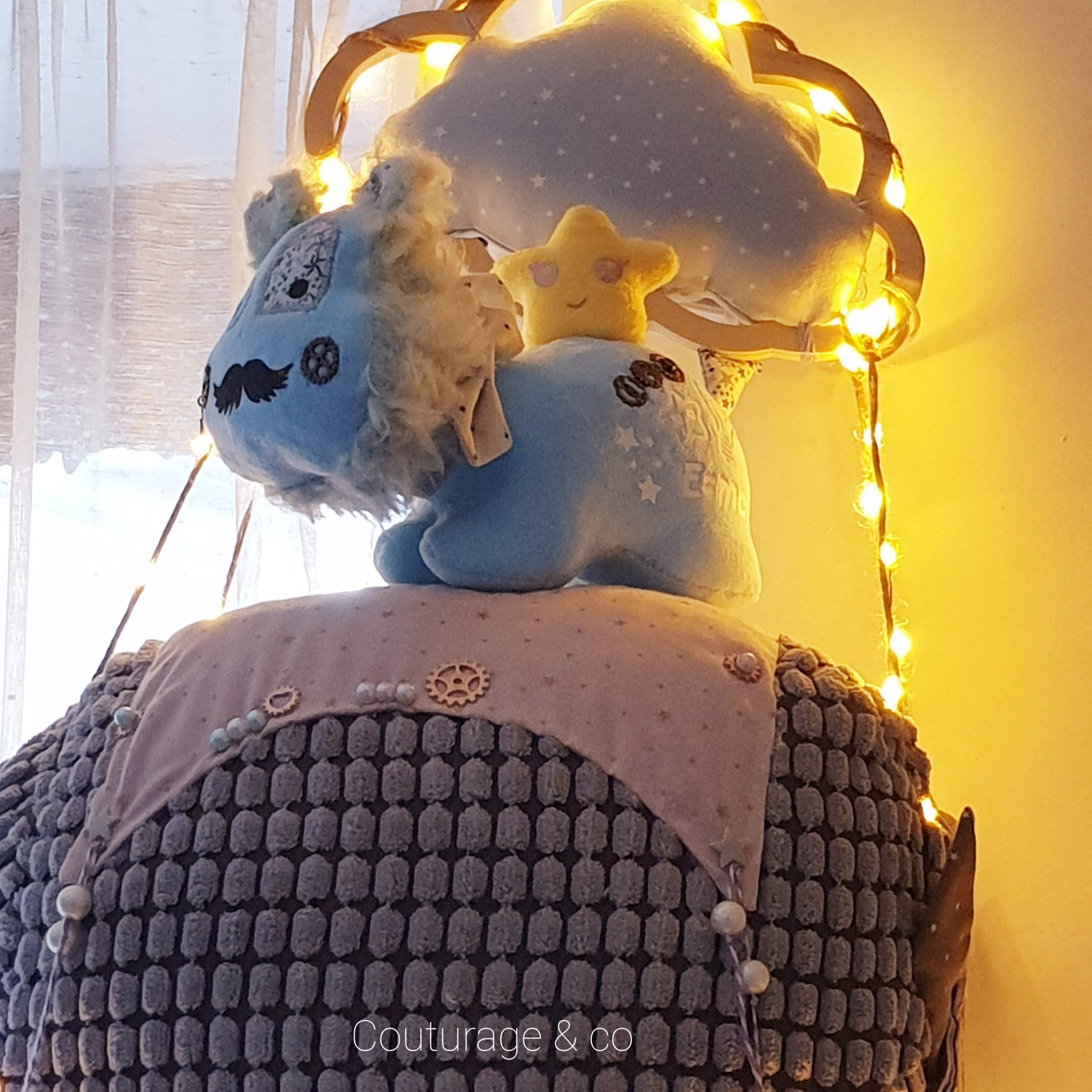 Comme habituellement tout est né sous mes petits doigts, douillette de chez Mondial Tissus, le minky de chez Kullalo, Liberty et popeline étoiles déniché chez Motif Personnel, la jolie feutrine pailletée provient de Cultura, les pressions étoiles arriveront dans ma petite boutique très prochainement ! Les boîtes proviennent de Cultura, customisées par mes soins à l’aide de différentes techniques, peinture et collage ! Les motifs en flex réalisé avec ma petite Cricut Joy, le petit bonbon qui sublime mes créations !