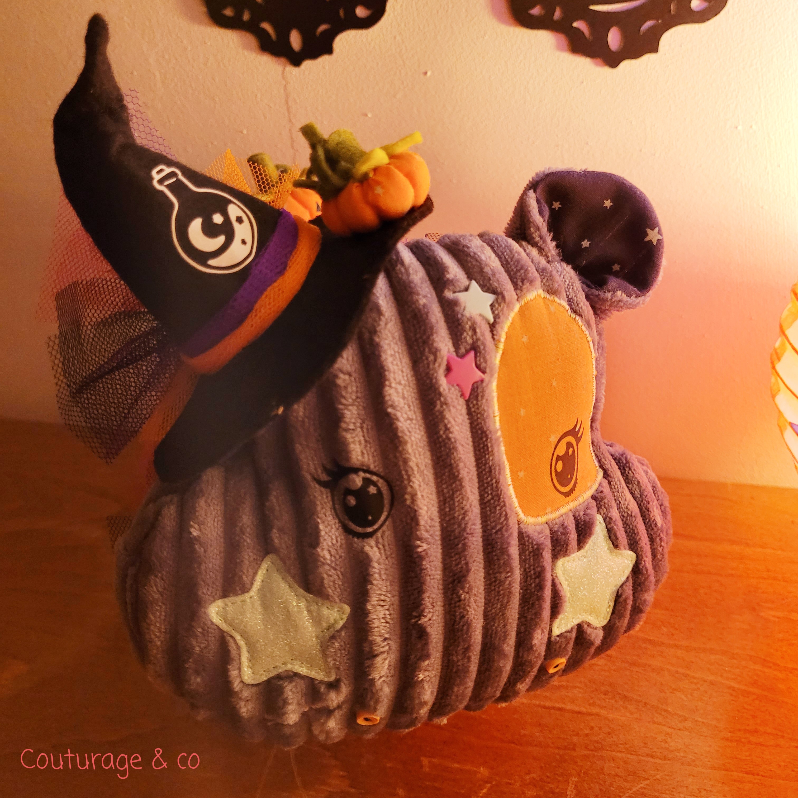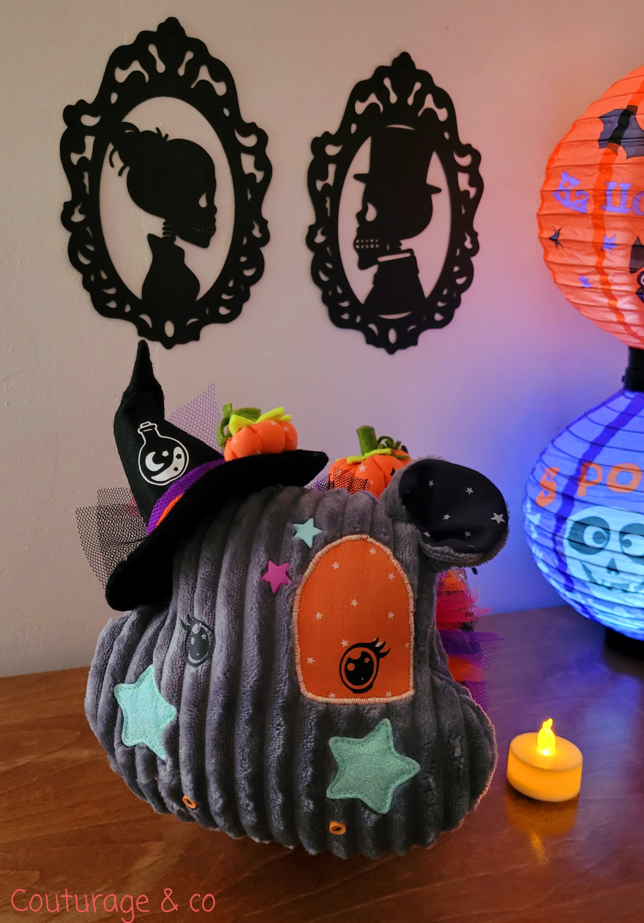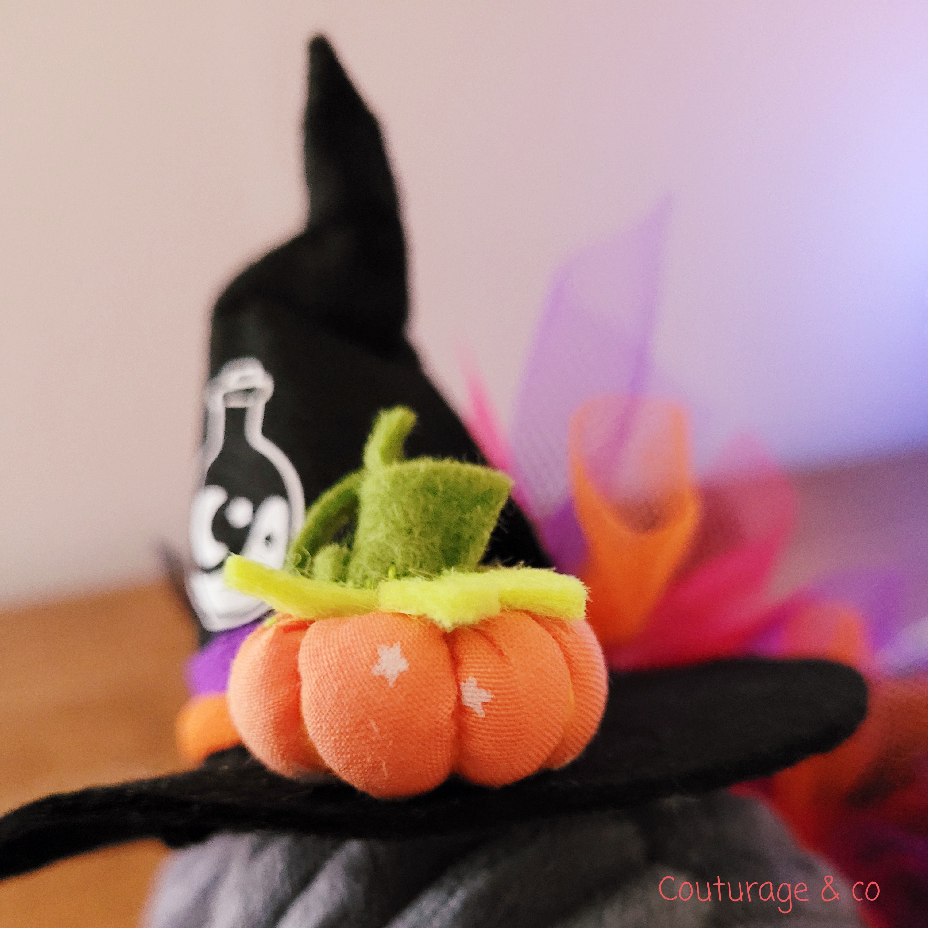 • Chapeau de Sorcière : patron maison, réalisé en Feutrine de chez Cultura, tulle de chez Mondial Tissus, motif en flex réalisé avec la Cricut Joy, petite Citrouille même modèle que Jack’O diminué