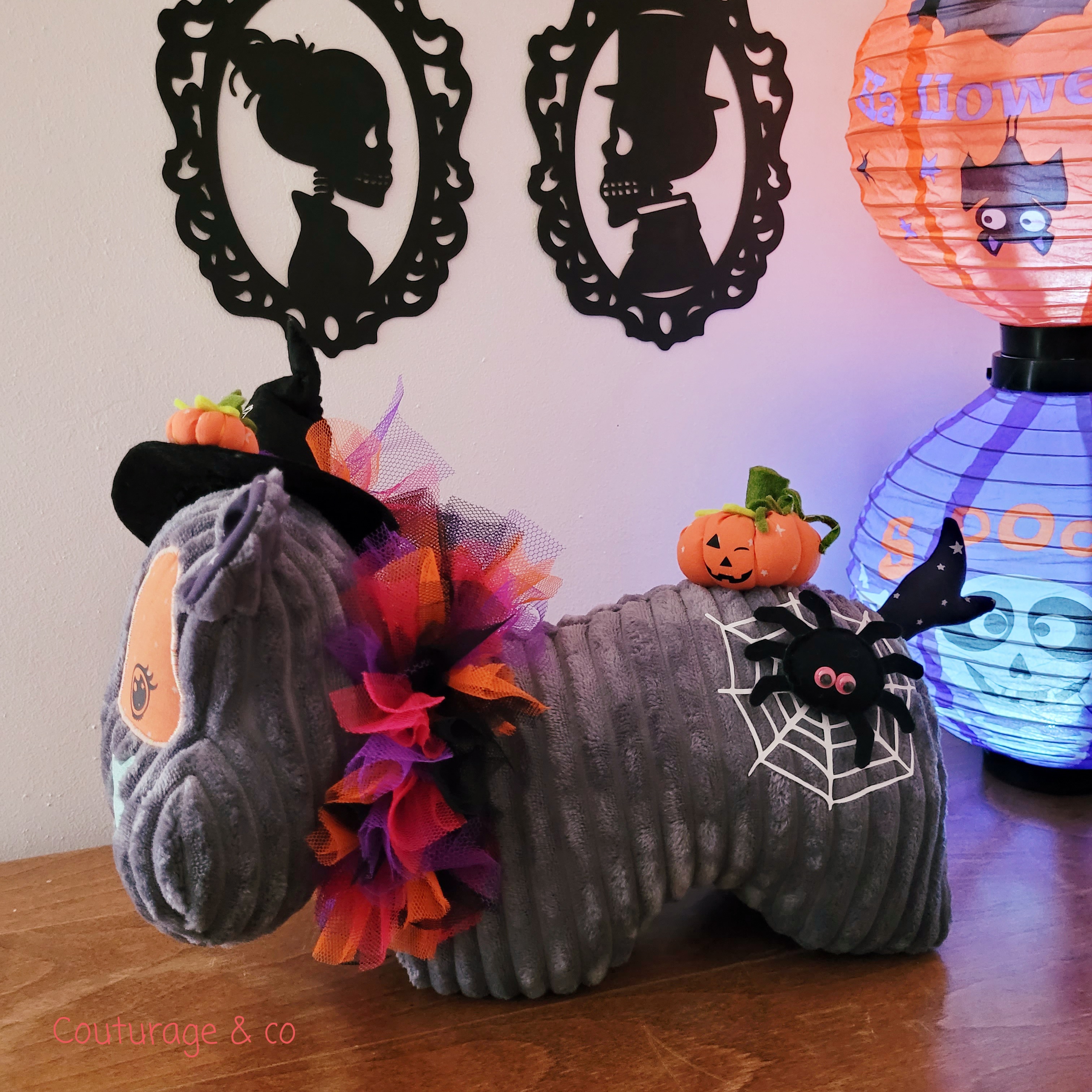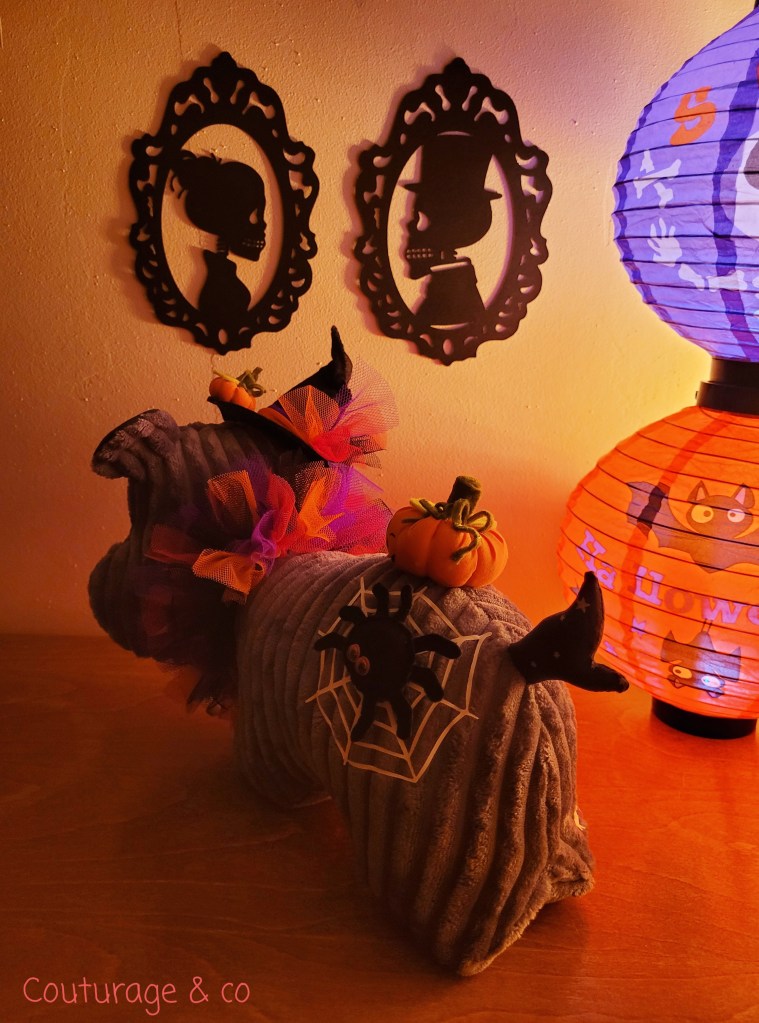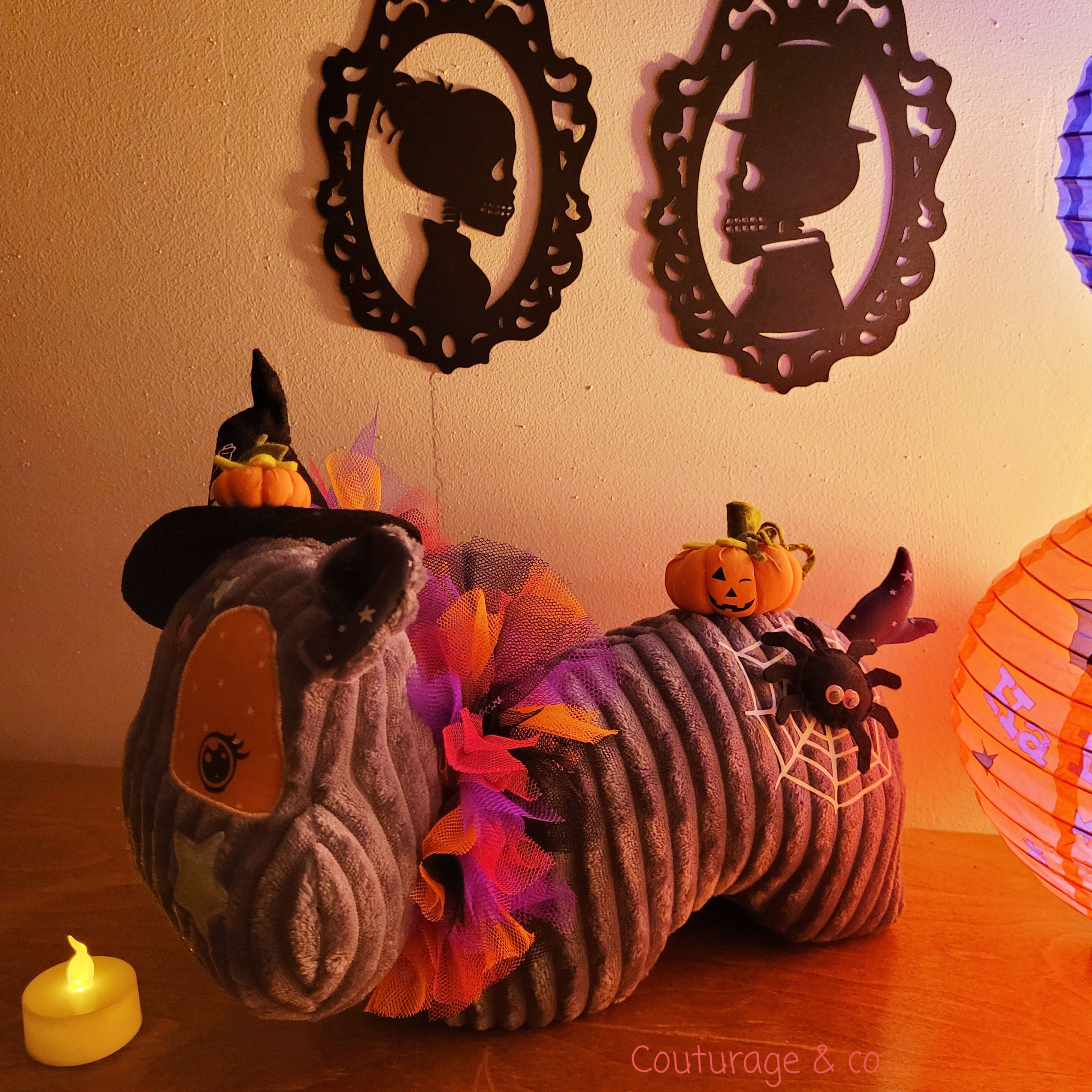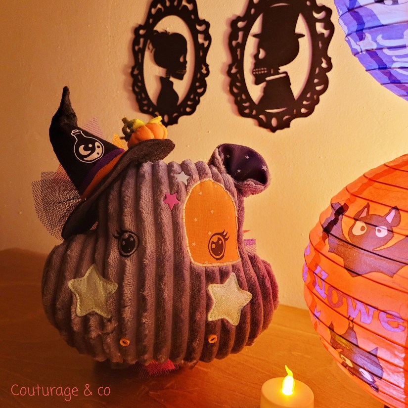 • Chapeau de Sorcière : patron maison, réalisé en Feutrine de chez Cultura, tulle de chez Mondial Tissus, motif en flex réalisé avec la Cricut Joy, petite Citrouille même modèle que Jack’O diminué