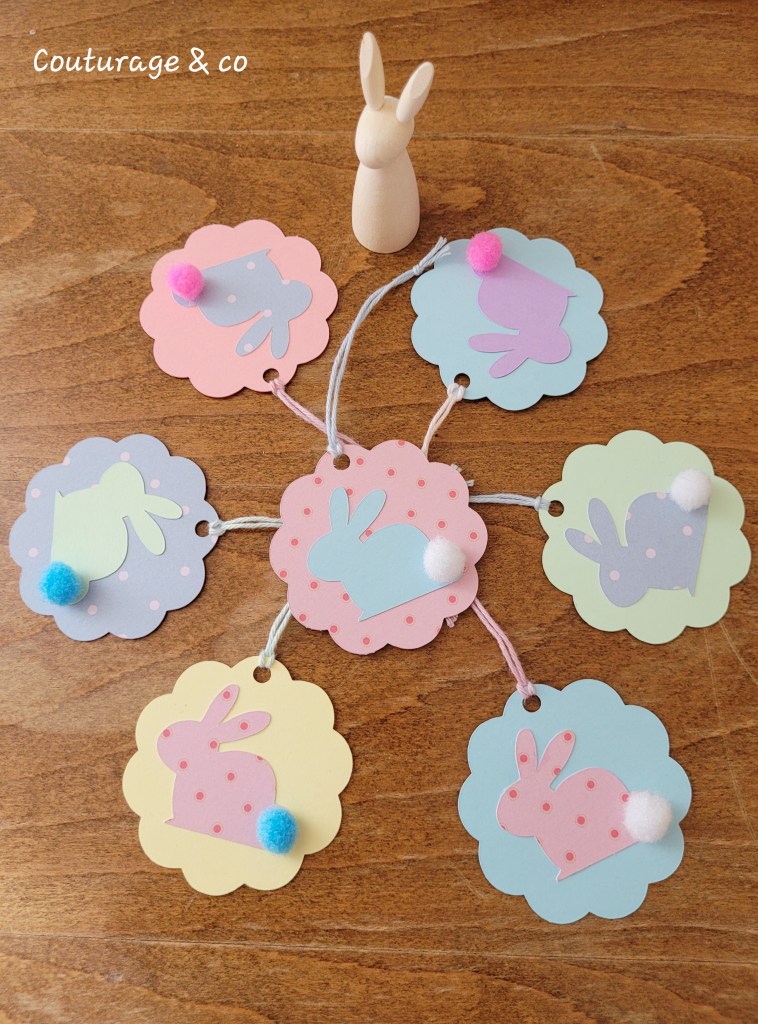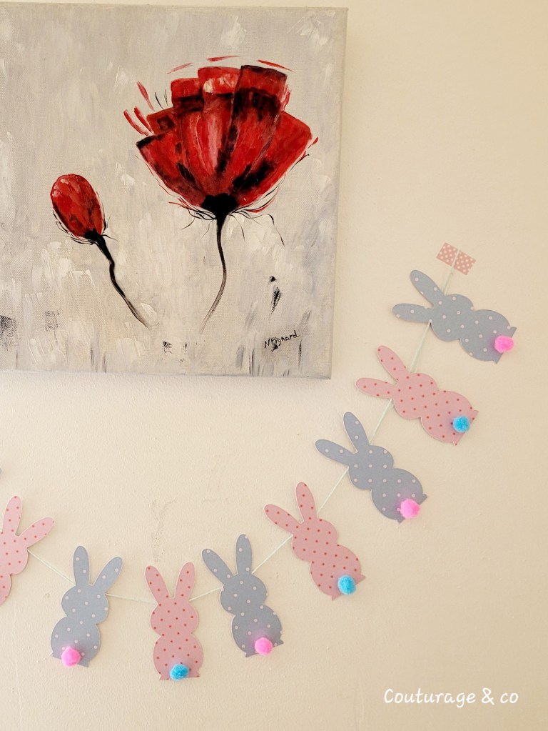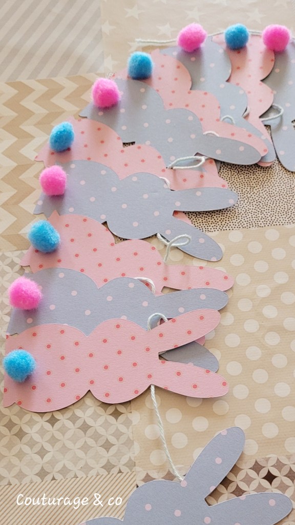 Une petite guirlande était dans un coin de ma tête ! J’ai utilisé mes chutes de papier pour la faire, et comme j’aime mettre une touche de fantaisie, les lapins ne sont pas conventionnels, mais en même temps c’était un peu mon idée et ça ne me ressemblerait pas si ça l’était ! 🙂