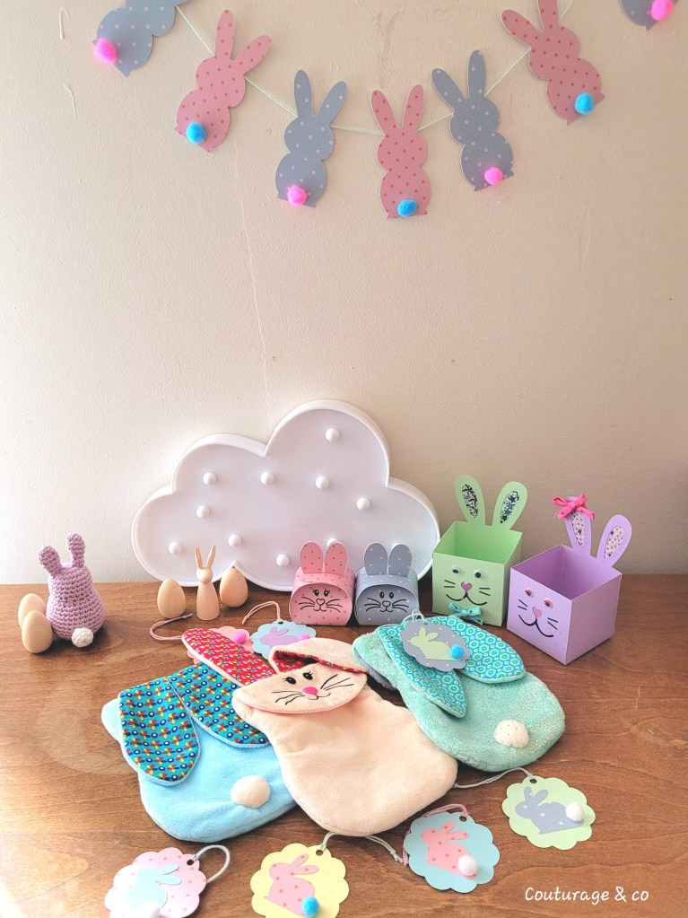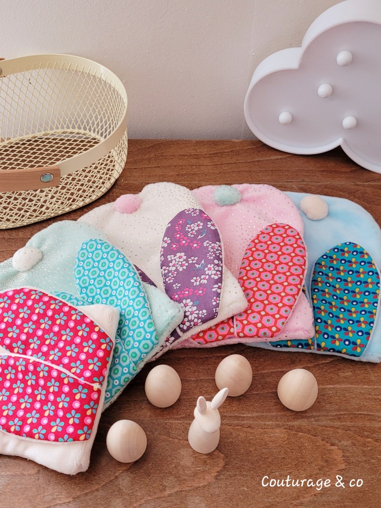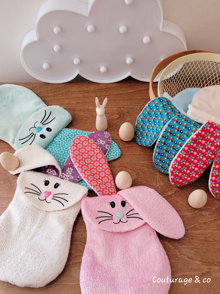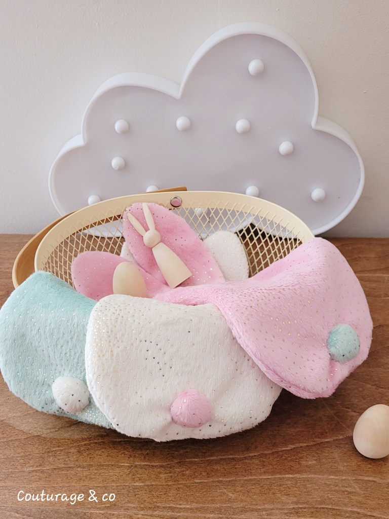• Minky Kullaloo pour les pochons lapins et tissus Petit Pan pour les oreilles.