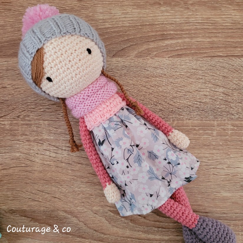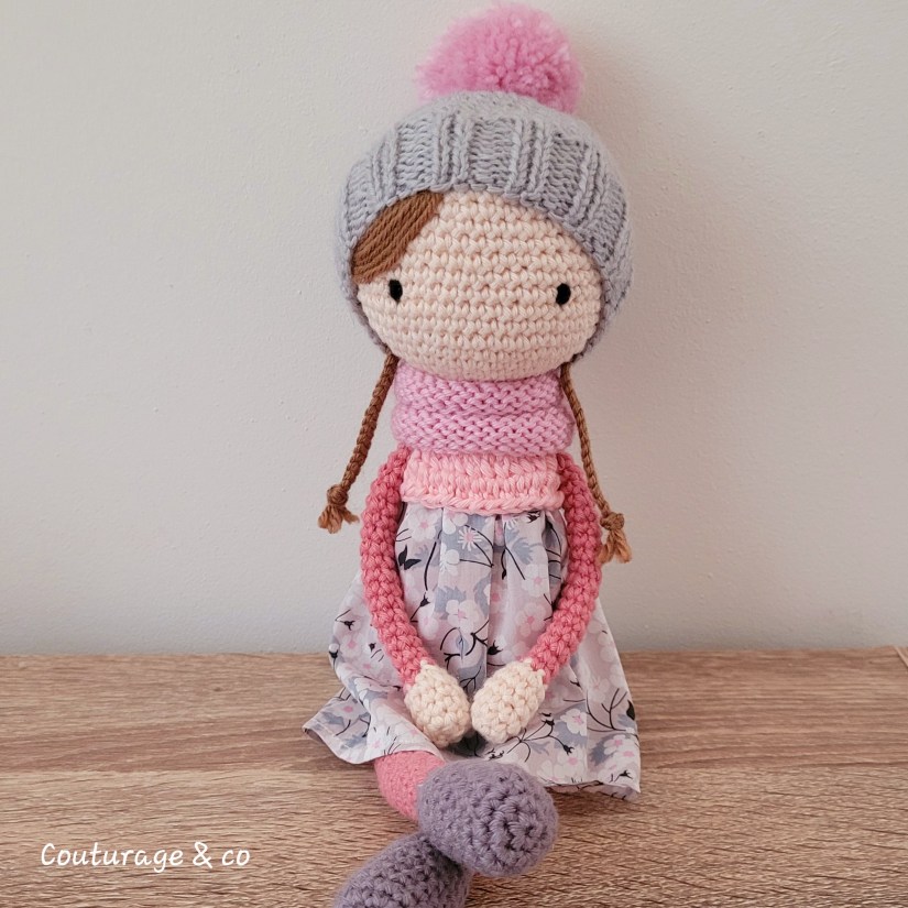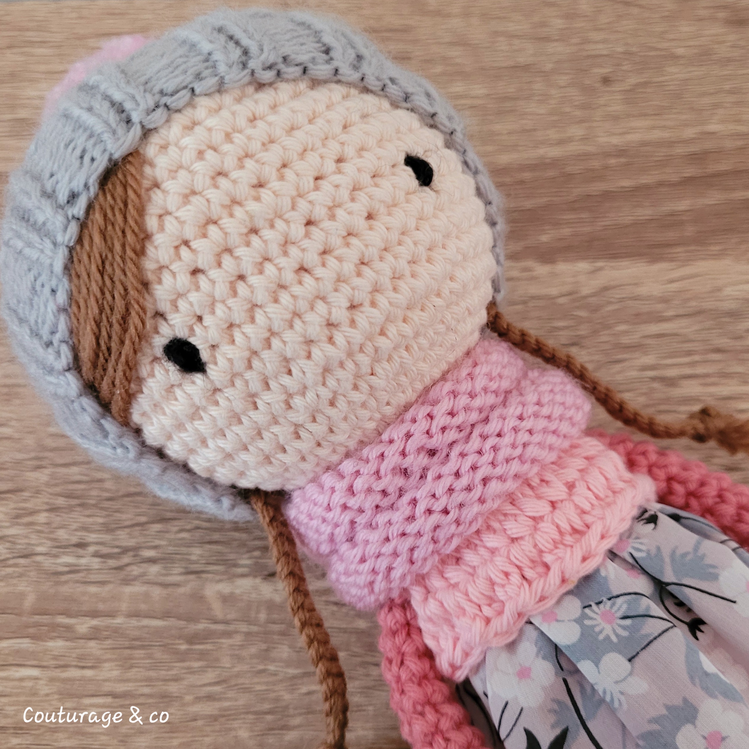 Ma Lisette mesure une trentaine de centimètres de hauteur, j’ai fait le choix de la crocheter à l’aide d’un crochet de 2.5 mm, selon les choix de chacun.e.s et sa propre manière de crocheter, la taille peut varier un peu. Pour les Fils, j’ai choisi les Cotons Ricorumi qui sont doux et sympa a travailler, et pour la laine la gamme Idéal de Bergère de France, j’avoue que j’en ai un stock en différents coloris, j’aime la travailler que ce soit en crochet et en tricot, et pour celles qui se souviennent, j’avais crocheter une dinette pour l’anniversaire de ma minette il y a quelques années. J’ai aussi la chance d’avoir une mercerie distributrice de Bergère de France qui s’est ouvert il y a quelque temps près de chez moi, et il m’est assez simple de m’en procurer rapidement quand j’ai besoin, pour les Cotons Ricorumi, sont disponibles dans mon Cultura.
