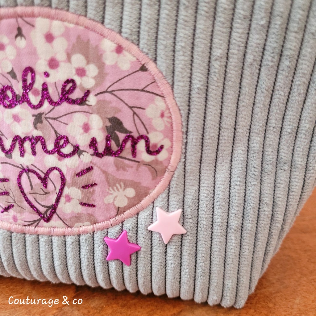 Pour Elle, j’ai ressorti un gabarit qui me semblait approprié à sa demande, simple, utilisé ses tissus préférés (du Liberty sinon elle ne serait pas ma fille, elle comprends vite ce qui est joli), un peu de paillettes pour le coté girly du petit message, un petit Pois Plume parce qu’elle est super mega fan de ces petites mignonneries et des messages qu’elles représentent.