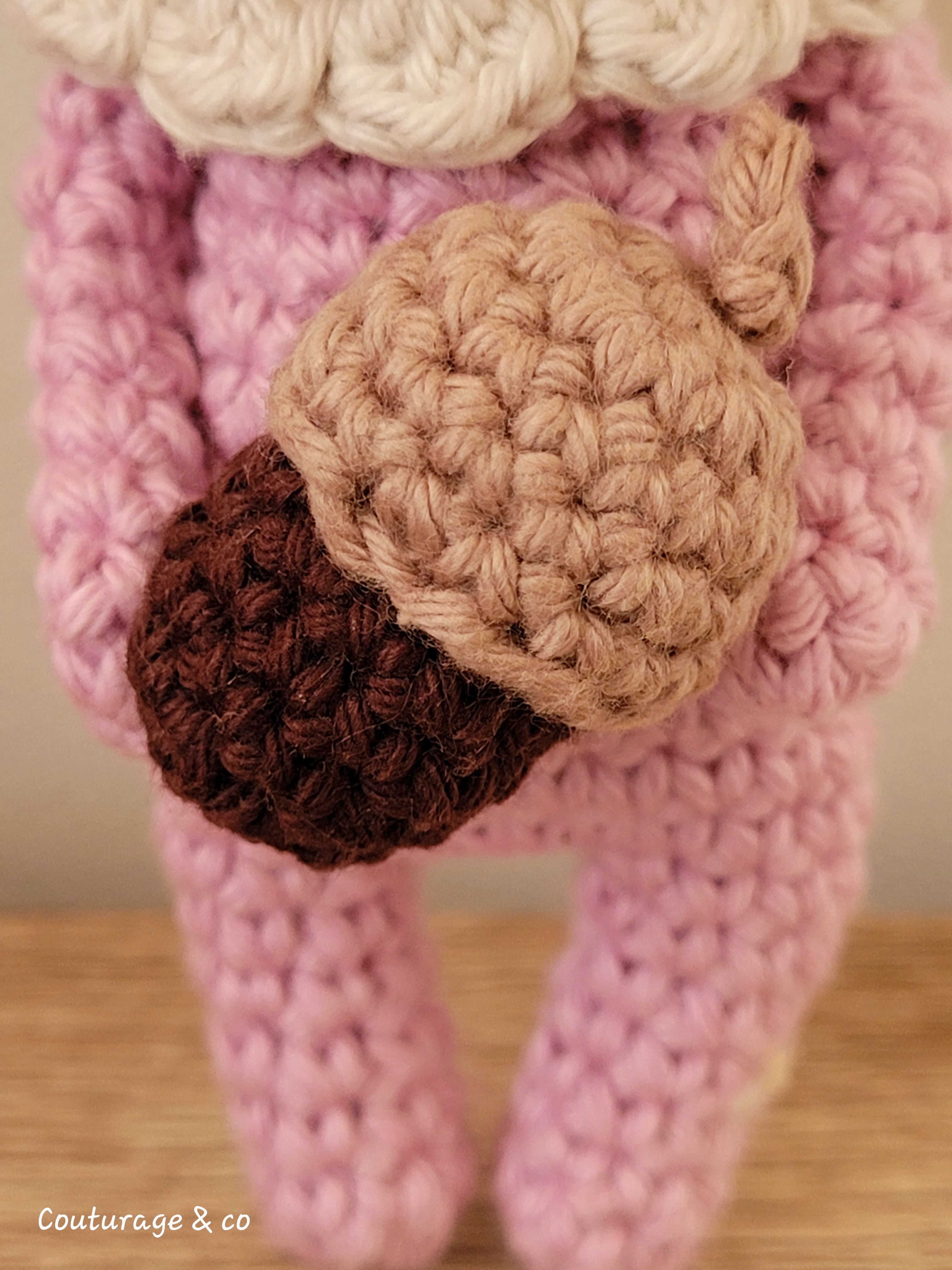 Les points spécifiques sont expliqués dans le tutoriel. C’est un vrai régal de voir naître cette petite poupee d’environ 15 cm de douceur sous mes doigts.