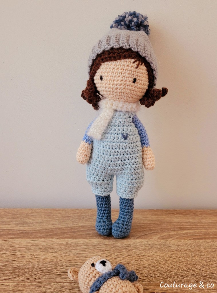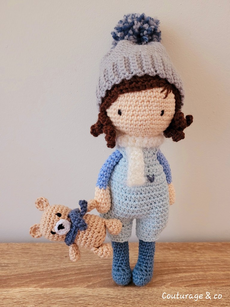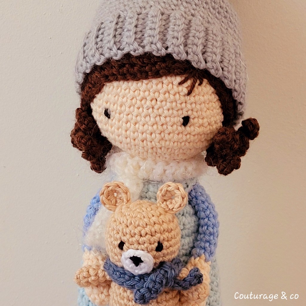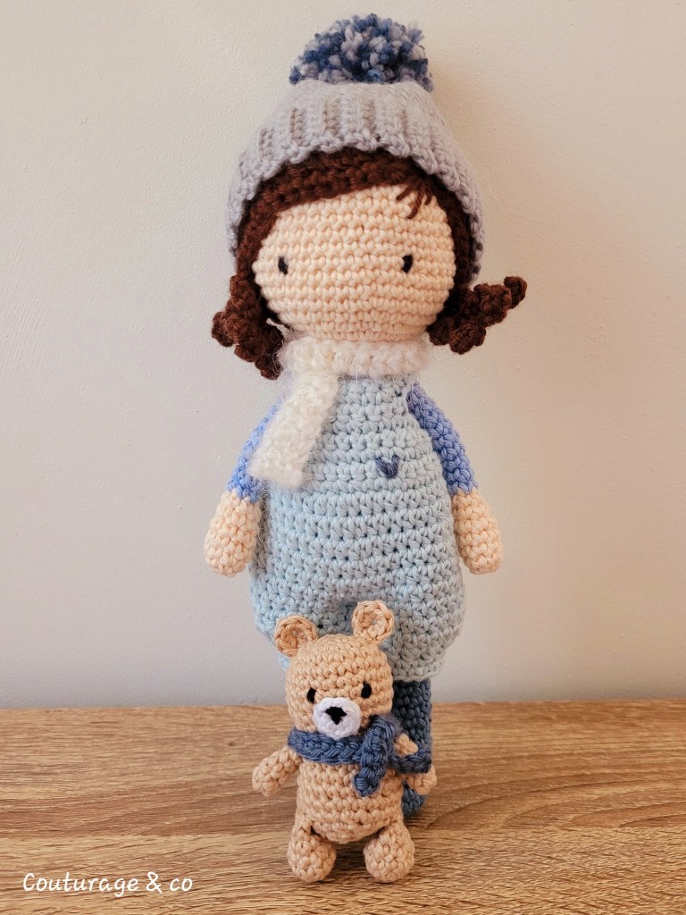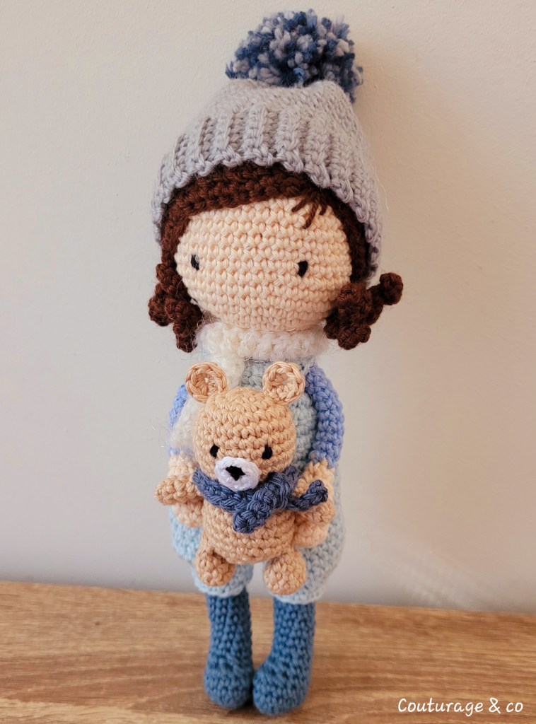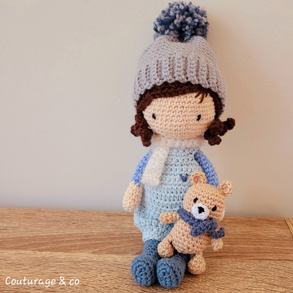 C’est donc sans attendre que j’ai réaliser Zoé ! Une petite poupée toute mignonne, avec son petit ours Doudou qu’elle promène avec elle.