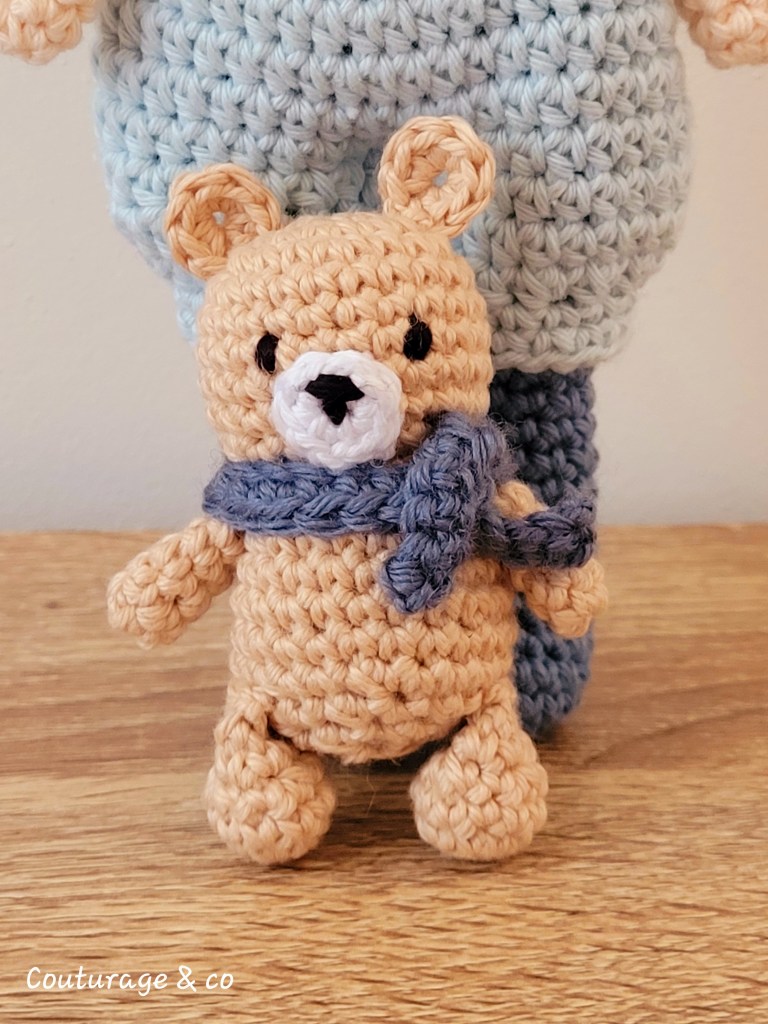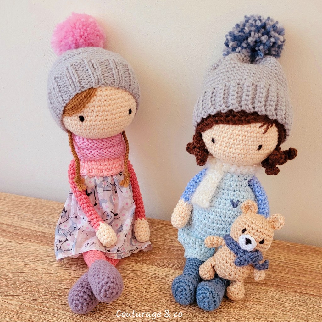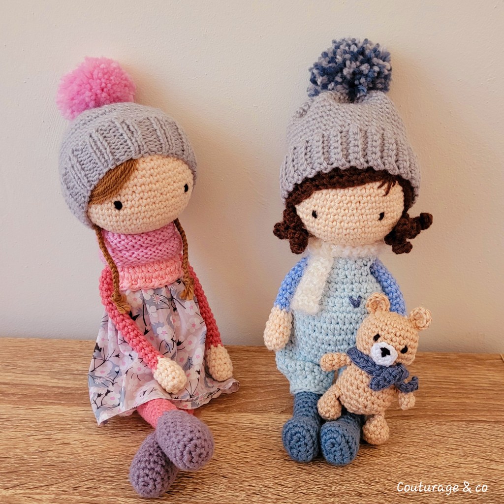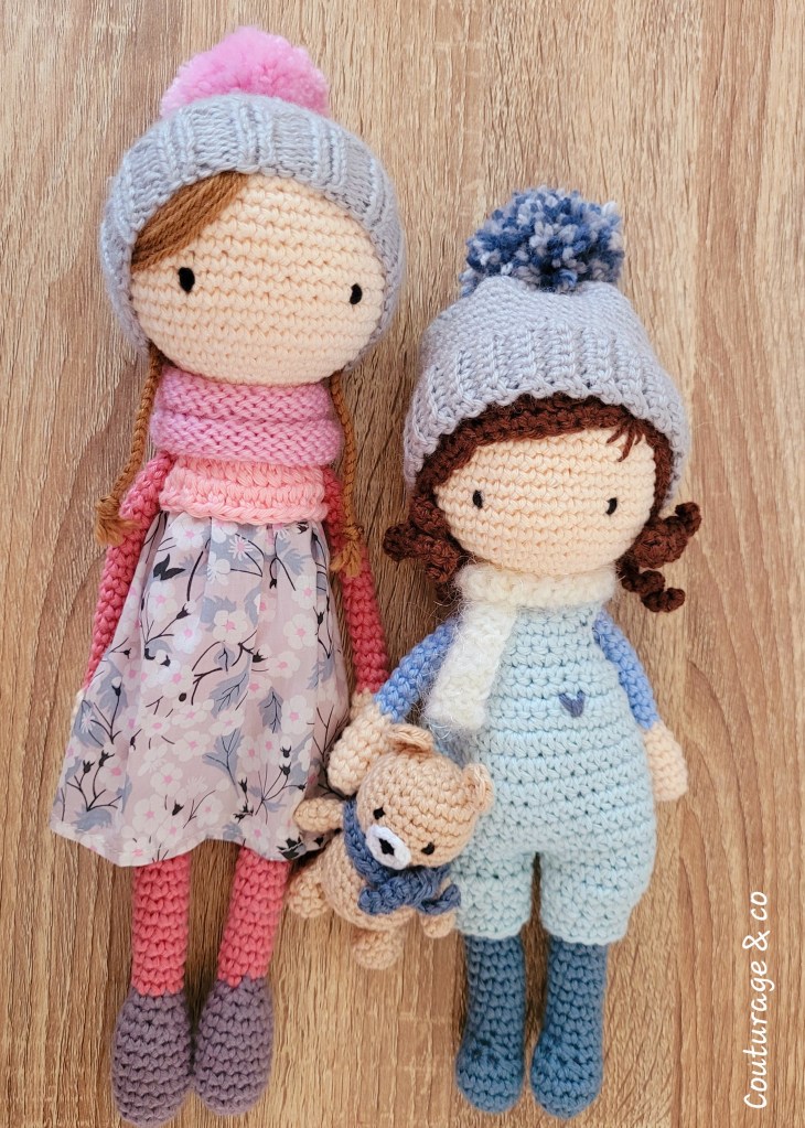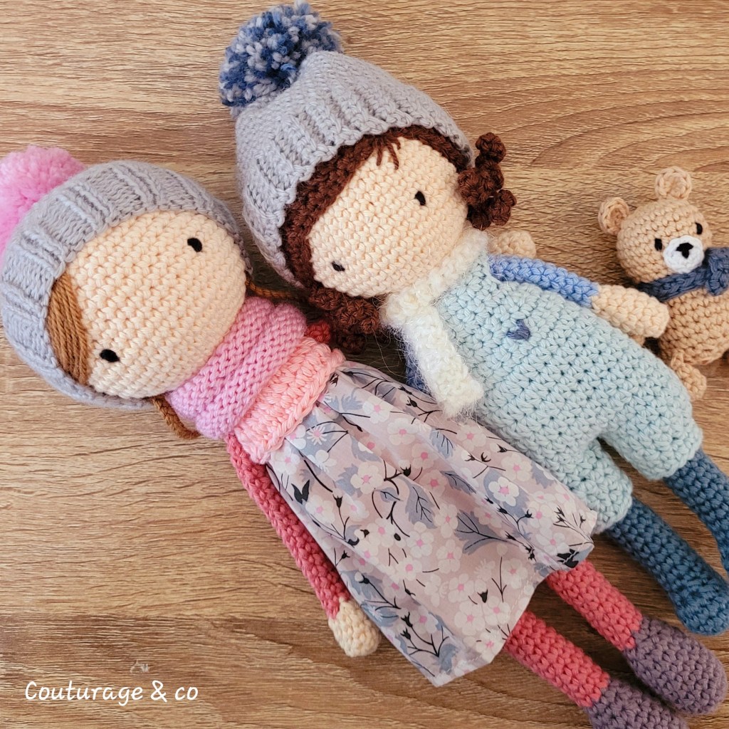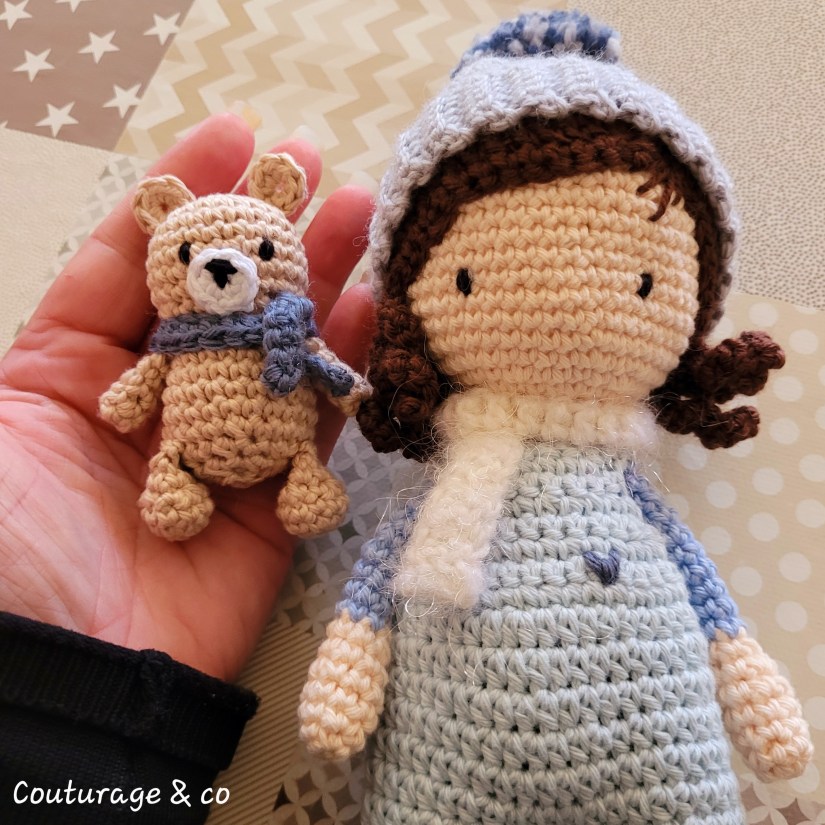 C’est donc sans attendre que j’ai réaliser Zoé ! Une petite poupée toute mignonne, avec son petit ours Doudou qu’elle promène avec elle.