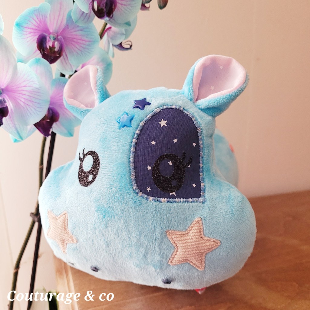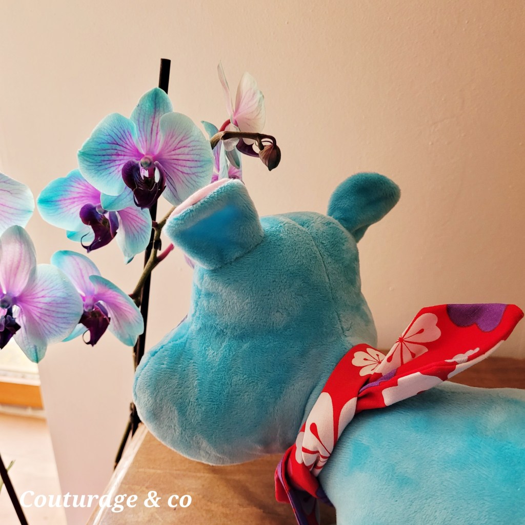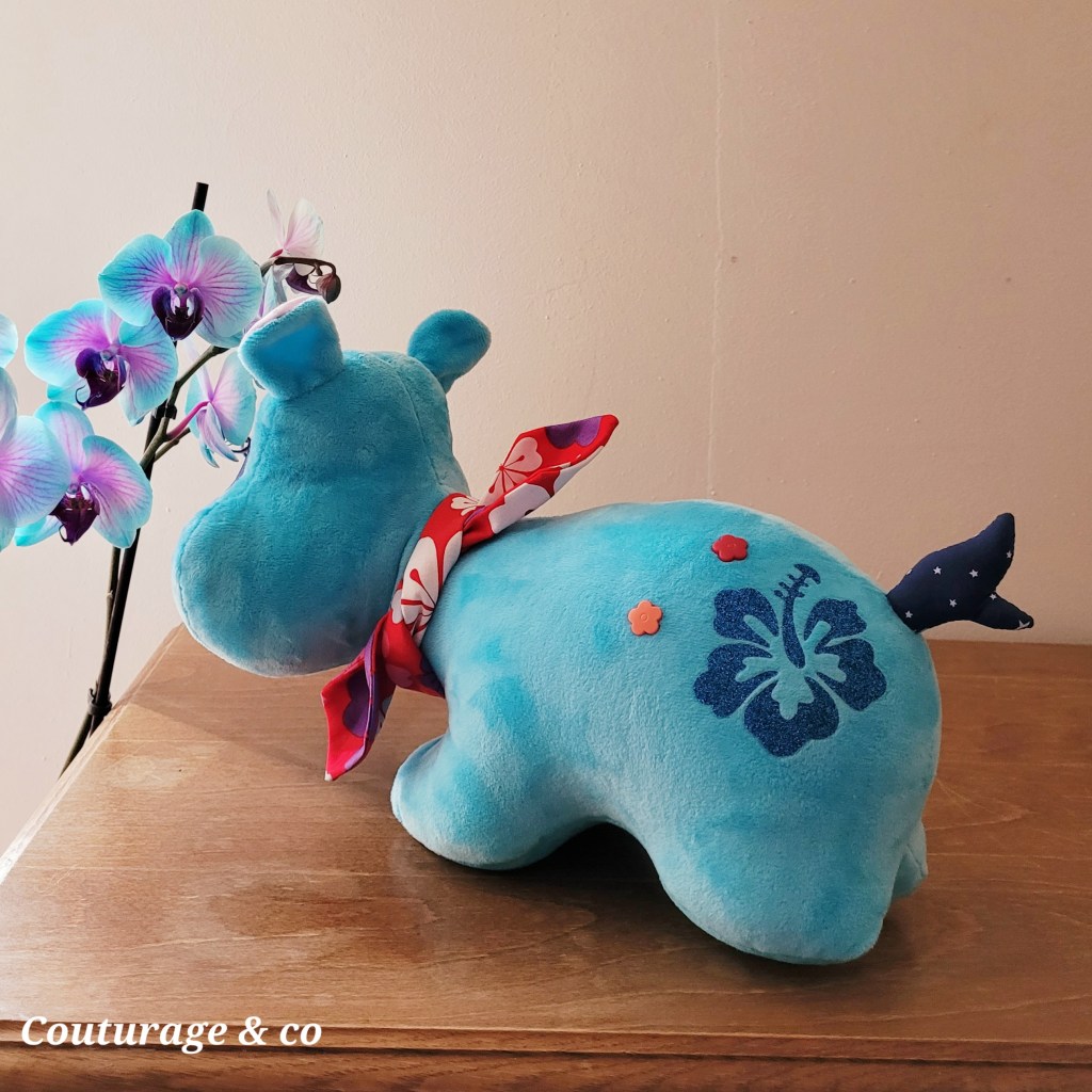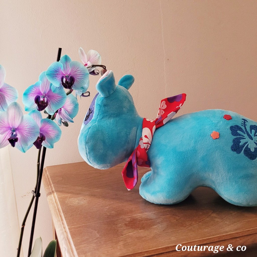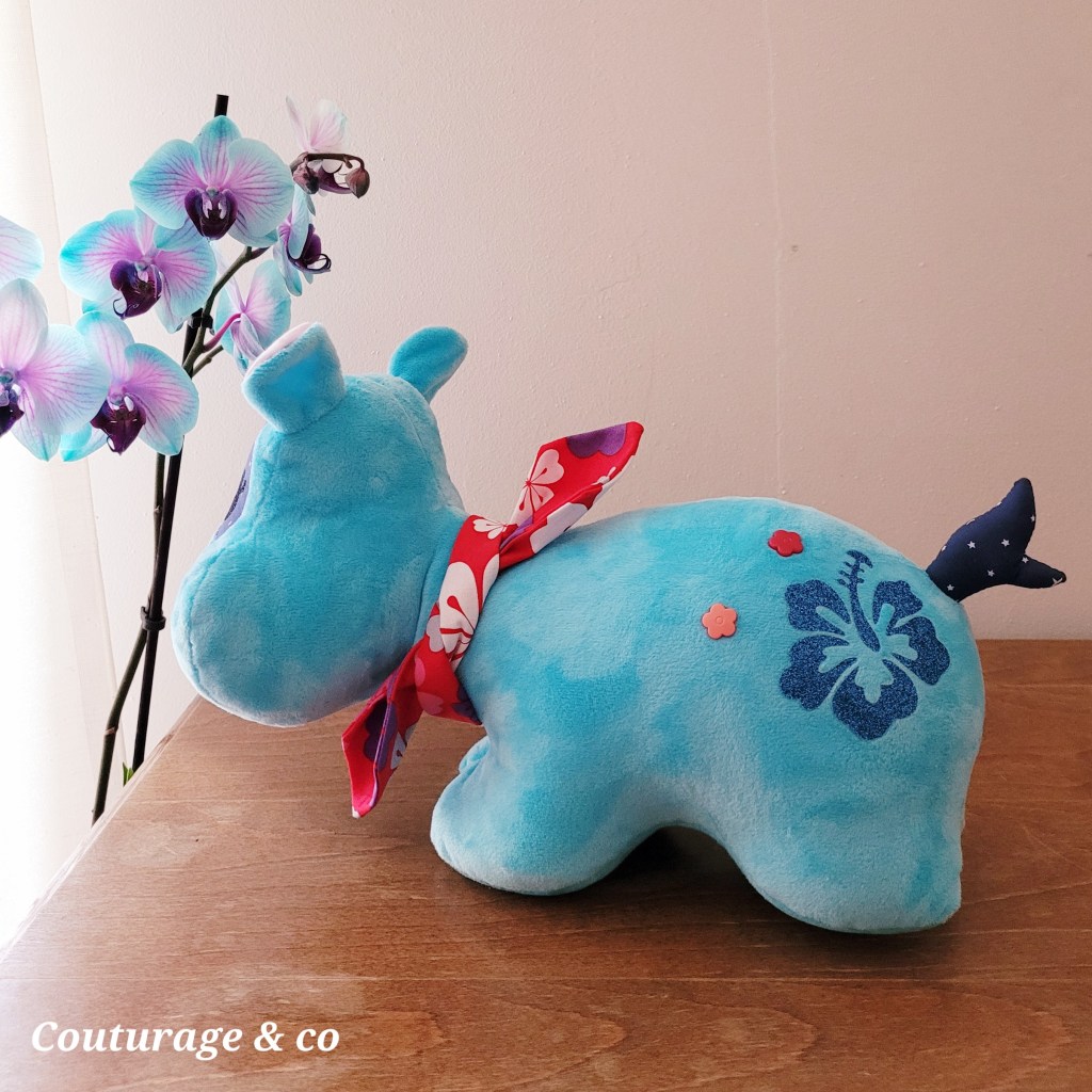 Ohana est une version détournée de ce modèle bonbon que j’aime tant, Vaglam l’Hippopotame, le patron provient du livre de Nath’ Mospher « Mon Nathelier à doudous ». Pour l’histoire, je suis tombée amoureuse de ce patron, c’est mon fétiche quand je dois offrir des cadeaux originaux ! Ces potams sont des pièces uniques et honnêtement, j’adore voir les yeux remplis d’étoiles des personnes qui les déballent et les reçoivent.