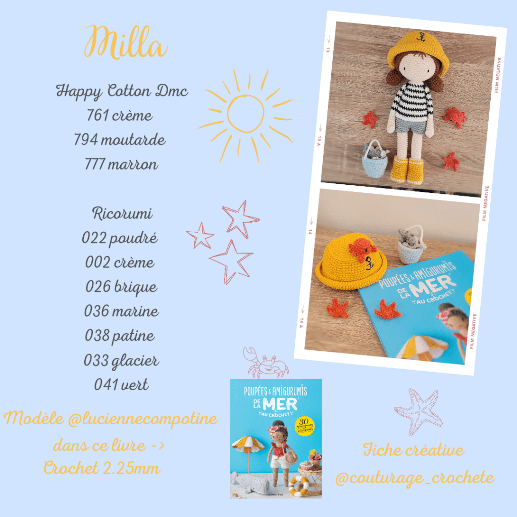 La parenthèse estivale à malheureusement une fin car ce n’est pas encore tout à fait l’heure des vacances pour moi, il me faut encore patienter quelques semaines, mais j’ai adorer prendre cette petite pause créative, je vous laisse ma petite fiche créative, ayant composé avec mes 2 palettes de couleurs préférées chez Ricorumi et Happy Cotton pour rendre Milla toute jolie !