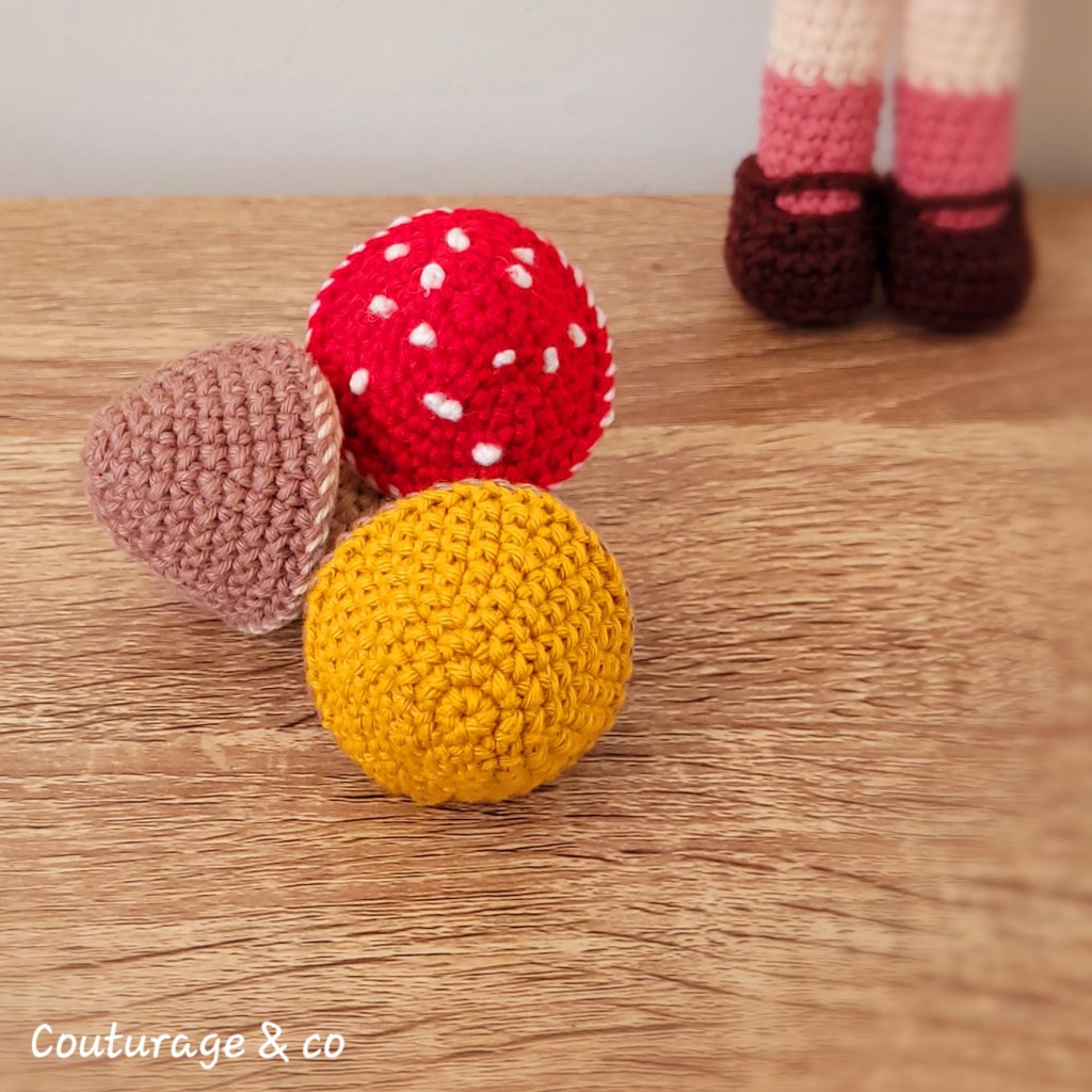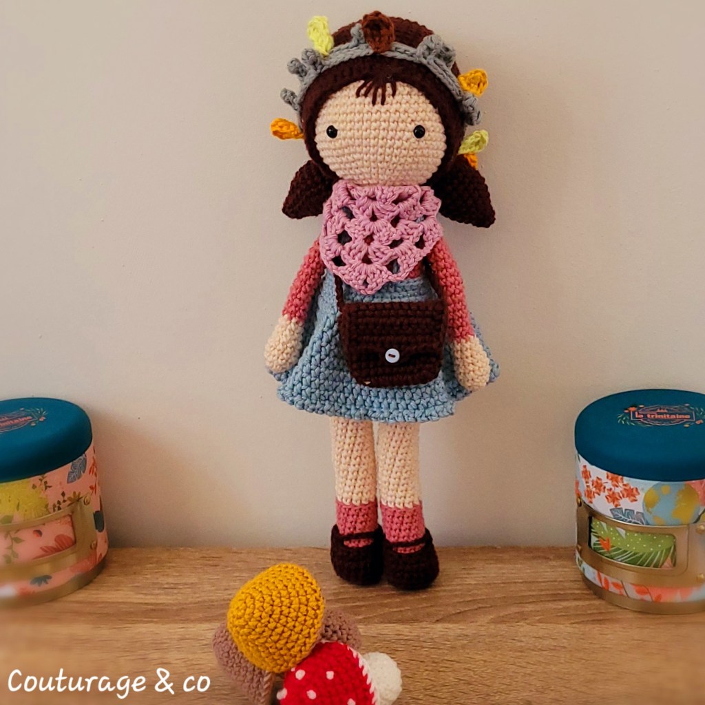 Une très jolie poupette, et ses petits accessoires automnal, des champignons, une petite citrouille et son sac besace. J’avoue pour la citrouille nous avons emprunté celle de Sissi !