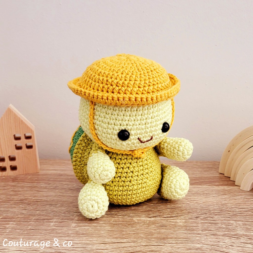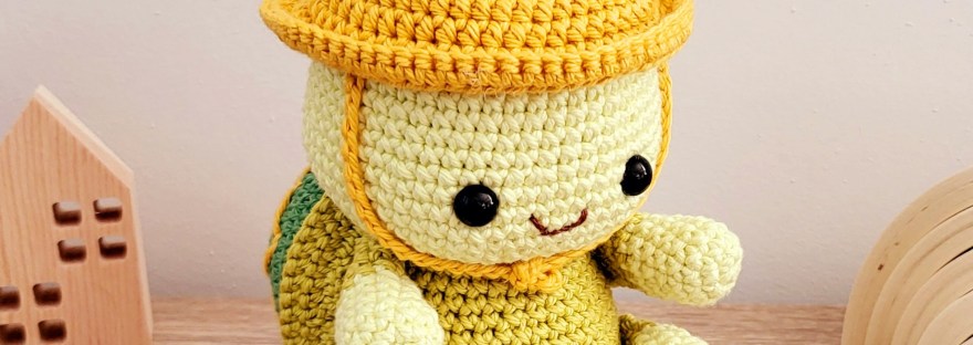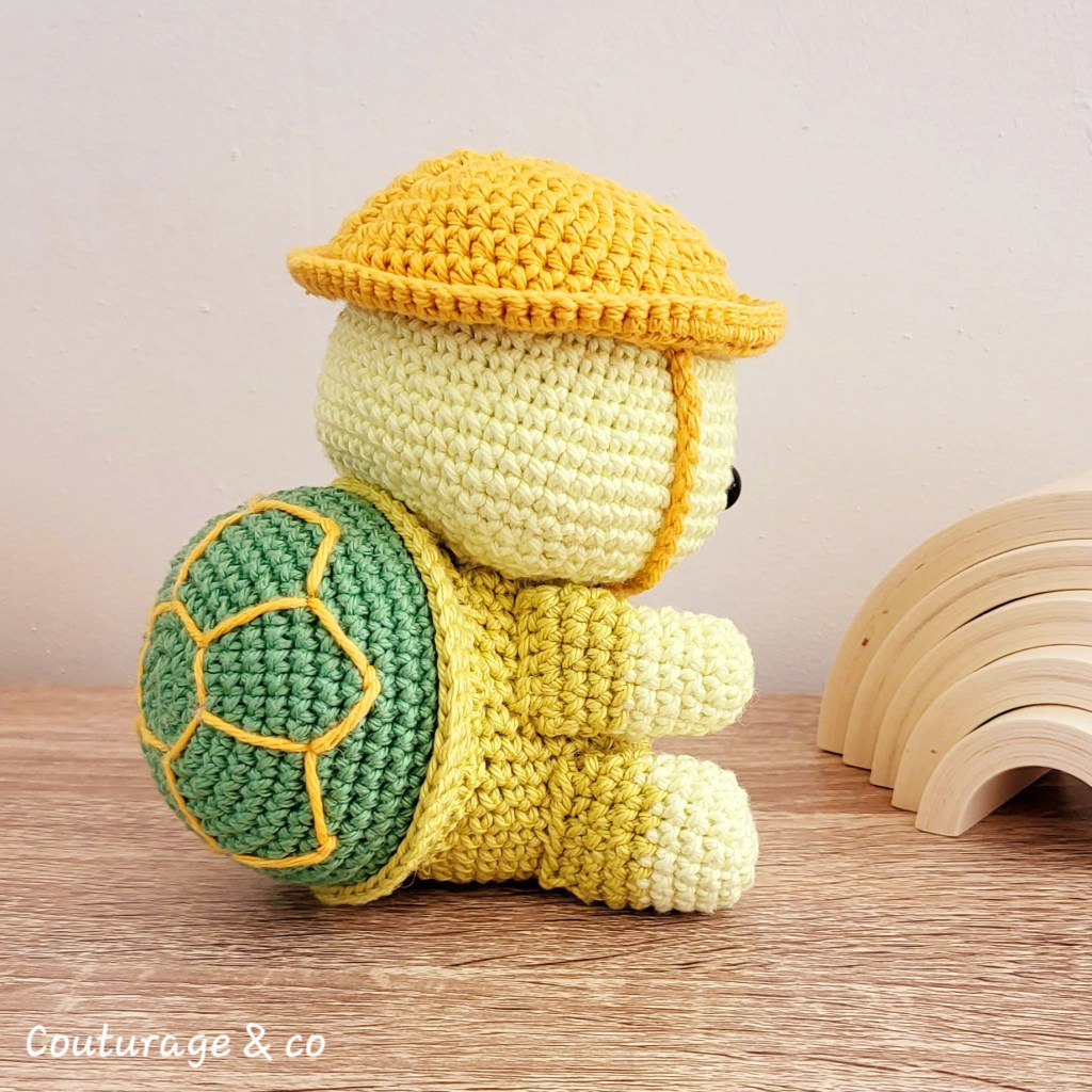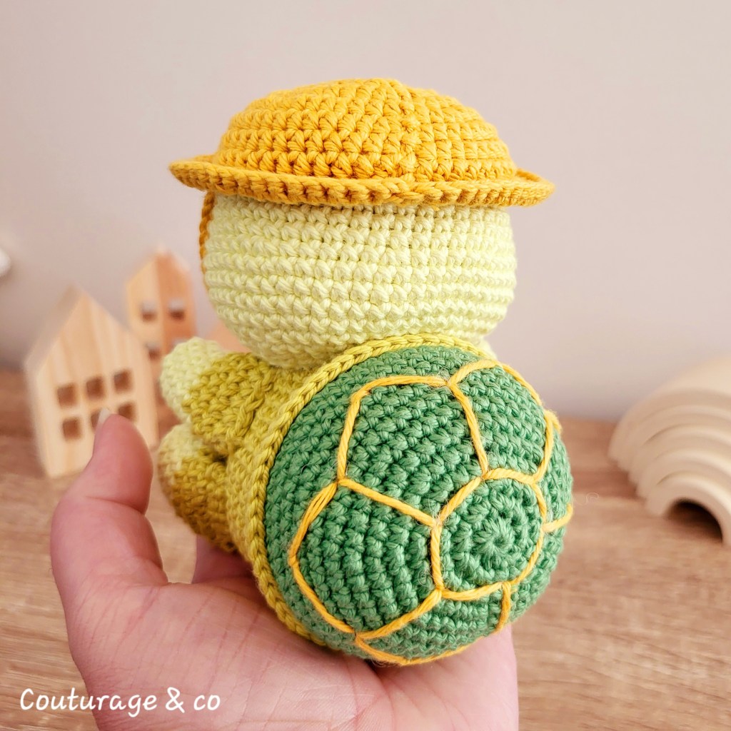 J’ai suivi les préconisations du livre, fils Happy Cotton de Dmc, en revanche cafouillage dans la liste, pas besoin de fil rouge comme indiqué, et il m’aura fallu 2 pelotes de fil vert clair. J’ai de plus crocheté en 2,25 mm, soit avec un crochet plus petit que celui préconisé. Et 2ème coquille dans l’explication des bras, j’ai donc adapté à ma sauce. Et bien sur, comme chez moi les petits doudous mangent bien à la cantine, cela a rendu difficile la couture de ma carapace qui était un peu trop rembourrée, qu’importe elle est mignonne quand même cette petite tortue !